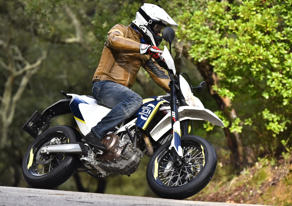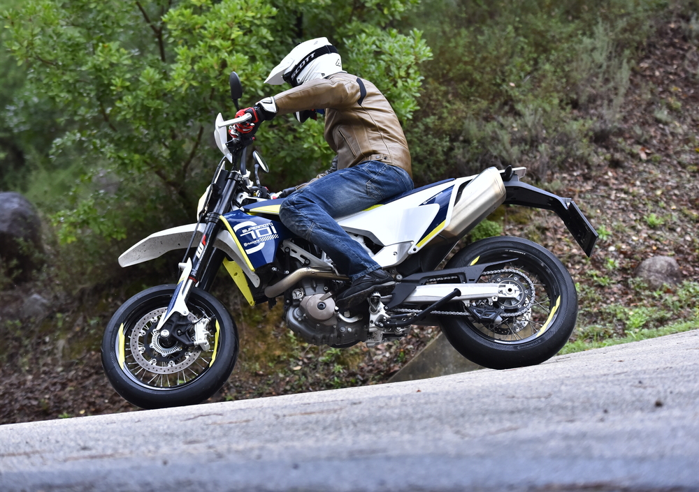 Volete una moto agile in città come una 125, che sia anche facile e tremendamente efficace tra le curve? La risposta potrebbe essere proprio la Supermoto 701. Non ci sono altre moto in commercio altrettanto leggere (145 kg) e potenti (67 cavalli), se si escludono le KTM dotate dello stesso motore 690. La sellona multicolor della 701 svolge egregiamente il suo lavoro, dona ampia libertà di movimento e ha il pregio di filtrare tutte le vibrazioni del potente propulsore monocilindrico. I comandi sono molto morbidi e anche il cambio è spaziato correttamente e rapido negli innesti; soltanto il passaggio dalla quinta alla sesta porta a qualche sfollata, se non si è decisi con la leva. La strumentazione è leggibile, ma un po’ troppo striminzita. Su una moto stradale con questo prezzo avremmo gradito la presenza del contagiri.