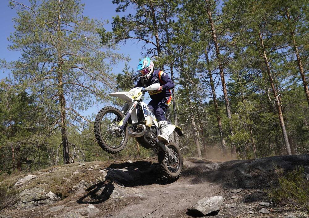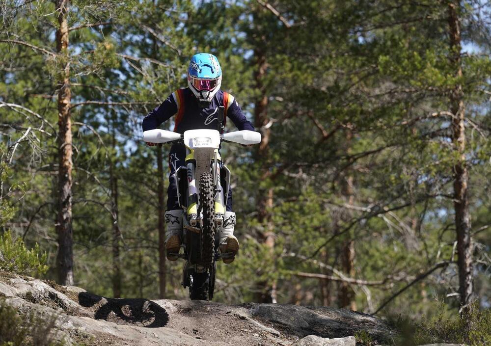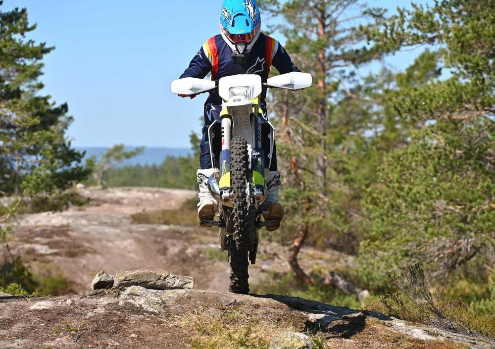 La FE 350 4 tempi si conferma una tra le scelte più azzeccate. Il motore è ancora più pieno in basso rispetto a prima e ti semplifica la vita, mentre in alto la potenza non manca mai (anche se nel percorso in Norvegia è stato difficile richiamare all'appello tutti i cavalli!).