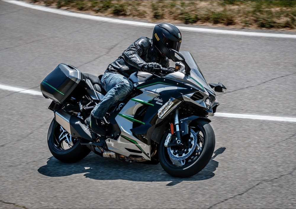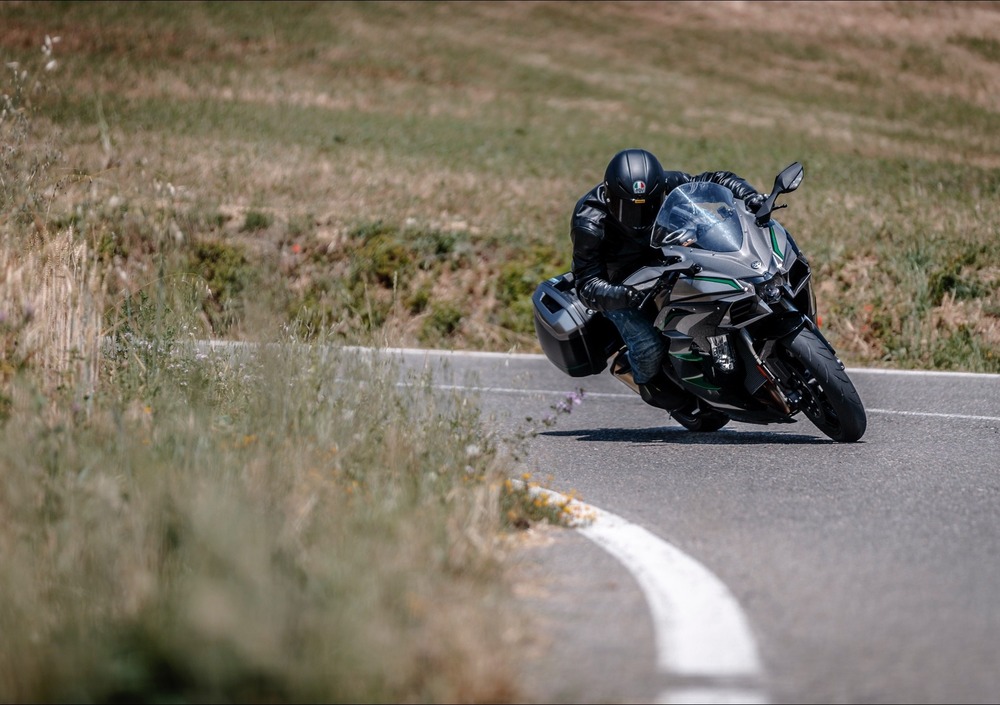 Occhio a non cadere nel facile errore: la Ninja da 200 cavalli non è un incrociatore da drittoni infiniti. La guidi da dio anche tra le curve dei nostri passi. Non è un fulmine, richiede una guida rotonda e il giusto movimento del corpo. Ma poi danza tra le curve con rara efficacia: ha un avantreno di marmo, che comunica tutto, ma proprio tutto al pilota. Il motore non ha alcun ritardo dovuto all’azione del compressore, ma spinge sempre come un toro. Metti la quarta, la quinta, persino la sesta (!) e affronti qualsiasi percorso a velocità surreali, ma sempre in sicurezza. Devi solo stare attento ai limiti, perché la H2 SX è così solida e precisa da mascherare sin troppo bene le reali velocità. Il cambio elettronico è preciso sia a salire che a scendere di marcia e la frenata è potente e instancabile.