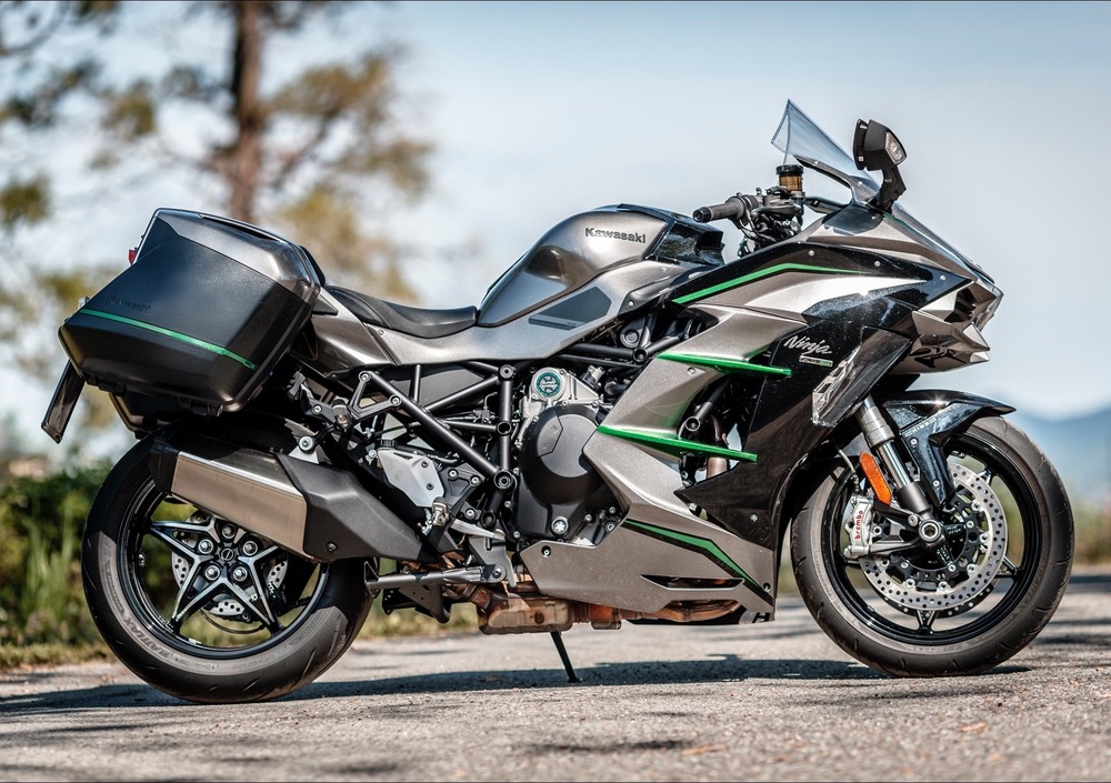 Esibizione ingegneristica senza pari, prestazioni semplicemente spaventose, razionalità e logica non pervenute. Questo il biglietto da visita della Kawasaki H2R, che anche in versione omologata per l’utilizzo su strada H2, non nascondeva anzi sbatteva in faccia al pubblico motociclistico numeri spaventosi e caratteristiche tecniche uniche, a partire dal compressore, capace di far erogare rispettivamente 310 e 200 cavalli di pura follia. Adesso tocca alla versione educata o meglio, meno sgarbata: la H2 SX, versione sport-touring, molto sport, un po’ meno touring, delle Supercharged di Akashi. Escludiamo sin da subito un confronto diretto con la sorella ZZR 1400, più voluminosa, più pesante (268 contro 256 kg), con una vocazione da vera brucia semafori e da passista autostradale, ma con caratteristiche di guida differenti e sicuramente meno sportive: la H2 SX esce dagli schemi, sia per le caratteristiche tecniche che per quelle dinamiche. Davvero difficile, o meglio impossibile trovargli una concorrente diretta. §Le due H2 (la versione “R” non la consideriamo neanche in quanto non omologata per utilizzo stradale), fanno parte della stessa famiglia, ma i punti di contatto tra la versione “SX” e la H2 standard sono decisamente meno rispetto a quelli che uniscono la H2 alla H2 R. Stesso stile, un design condiviso sulla carta, molto meno nella realtà, con il vestito che ricorda - ma è molto diverso - un gruppo ottico che richiama, ma che è differente, e con il posteriore pensato per un passeggero, e che può accogliere anche un paio di borse, a differenza di quello rastremato e monoposto della H2; e inoltre un serbatoio che aumenta di volume da 17 a 19 litri. Rimane in bella vista sul cupolino il logo di Kawasaki Industries, a significare che anche questa H2 SX nasce dall’ormai pluri-decennale esperienza che Kawasaki ha consolidato in campo aeronautico/aerospaziale.