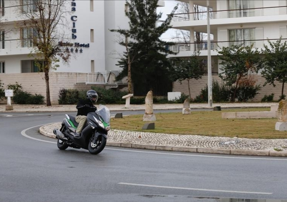 Il J300 fila dritto e rigoroso anche in prossimità della velocità massima – abbiamo visto velocità oltre i 150 di strumento in alcuni estemporanei allunghi, con il GPS che offriva scarti contenuti ben al di sotto del 10% - e non soffre particolarmente nemmeno le chiazze di bagnato e i malefici venti laterali che abbiamo incontrato in prossimità della costa atlantica. Se poi si trova un bel misto lo scooter Kawasaki diventa giocoso e rassicurante: sempre stabile in traiettoria, offre tanta confidenza e appoggio anche avvicinandosi al limite della luce a terra, e le sospensioni trasmettono abbastanza fedelmente il grip messo a disposizione dalle coperture Maxxis di primo equipaggiamento.