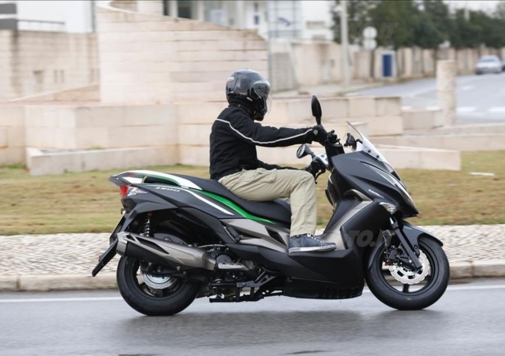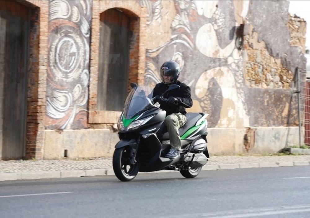 Potrà sembrare strano dirlo di uno scooter, però il J300 offre il meglio di sé quando si esce dalla città. Stabile e preciso, nonché capace di un certo feedback grazie a sospensioni appunto ben dotate quanto a tono idraulico, il Kawasaki si rivela davvero gustoso e gratificante quando ci si vuole divertire un po’. Non vi prenderemo in giro parlando di “DNA Ninja”, ma l’apporto dei tecnici di Akashi c’è stato e si sente. Una per tutte: le grip pads sui fianchi del tunnel e la conformazione del raccordo fra quest'ultimo e la sella contribuisce effettivamente a dare un feeling più motociclistico, a "sentire" con caviglie e cosce un qualcosa di (vagamente) paragonabile alla sensazione trasmessa dal serbatoio di una moto vera. E gli stessi svasi nelle pedane fanno sentire più sportivi alla guida grazie alla possibilità di poggiare il piede sull'esterno imitando la guida di corpo delle moto vere.