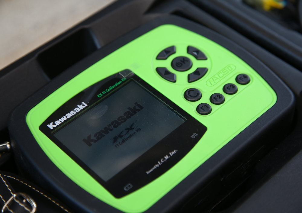 Kawasaki ha sempre avuto un ottima erogazione ed ora questa è ancora più personalizzabile. Si può fare in maniera molto rapida e veloce grazie ai 3 spinotti da cambiare a lato del cannotto di sterzo che intervengono in maniera differente sulla gestione dell’iniezione elettronica, nelle posizioni Standard, Hard (motore più pronto e potente) e Soft (motore più sornione e lento a salire). Durante il test abbiamo avuto modo di testare tutte le soluzioni: se in configurazione Hard le condizioni del tracciato di prova erano piuttosto difficili in quanto il terreno duro e bagnato di Maggiora era particolarmente scivoloso, tra Standard e la Soft abbiamo personalmente preferito la seconda in quanto, essendo più corposa all’inizio, consente di guidare in maniera più fluida e pulita ed, alla fine, più efficace.