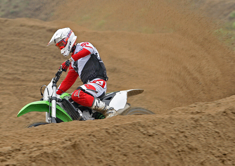 In ordine di marcia la nuova KX svela i suoi tratti caratteristici in quanto, conferma la ben nota ed apprezzata stabilità, in particolar modo alle alte velocità. Personalmente definiamo l’impostazione di questa Kawasaki di “vecchia scuola” in quanto è da gestire e guidare con la massima precisione e progressione, ma una volta impostata la propria guida seguendo una linea progressiva e pulita, l’abbinamento moto/pilota è in grado di portare grandi risultati sia in termini di prestazioni che di divertimento. Il grande valore aggiunto di questa quattroemmezzo è senza dubbio che, pur essendo molto potente ed impegnativa, risulta altrettanto prevedibile e questo trasmette grande fiducia a chi è in sella, soprattutto nei canali. Mentre ti avvicini alla curva stacchi in tranquillità nelle buche profonde di Ottobiano perché difficilmente si scompone o si avvita, poi appena inserisci inizi a dare gas e lei si distende senza incertezze né irruenza facendoti risparmiare tante energie. Passi con facilità la sezione waves, perché basta stenderti bene indietro per ottenere un’ottima trazione ed una stabilità difficilmente pareggiabile. Sui salti è prevedibile, si sposta con semplicità e non è mai nervosa.