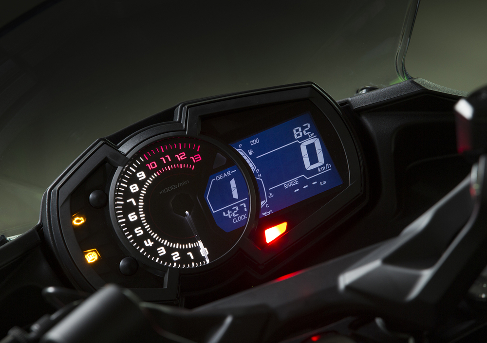 Il cruscotto è più ricco rispetto a quello della quasi gemella Z650. Al centro c'è un ben visibile contagiri analogico, che ospita l'indicatore digitale della marcia inserita; a sinistra troviamo la serie di spie di servizio e a destra c'è il display LCD multifunzione che, oltre alle tradizionali informazioni, indica anche temperature, autonomia, consumi istantanei e medi, oltre all'avviso di quando si guida nei parametri di consumo Eco. Non manca, infine, la spia lampeggiante, programmabile ed escludibile, per il regime di cambio marcia: quando si arriva al limite impostato, anche l'ago del contagiri si colora di rosso.