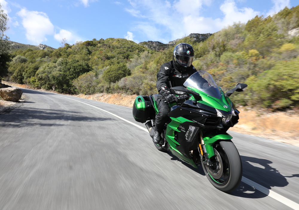 D’altronde, dimensioni e peso della H2 SX sono tagliati su misura non tanto per muoversi agilmente in città o a bassa velocità, quanto per pennellare curve ampie e divorare rettilinei: lo si evince anche da una posizione di guida che nello stretto crea qualche problema ai palmi delle mani, in verità piuttosto caricati. Il peso non proprio da ballerina e le geometrie della ciclistica, che privilegiano la stabilità anche a velocità siderali, consigliano di usare il corpo per accompagnare la discesa in piega e nei cambi di direzione, azione senza la quale ci si trova a dover spingere sui semi manubri affaticando proprio i palmi delle mani. Una volta prese le misure,però, ci si può godere una ciclistica granitica, con sospensioni che hanno un assetto piuttosto sostenuto e in grado di mantenere la H2 SX stabile e precisa anche in presenza delle borse laterali e di un passeggero a bordo.