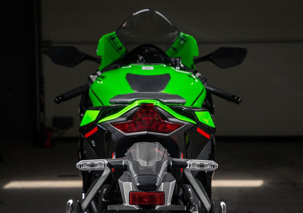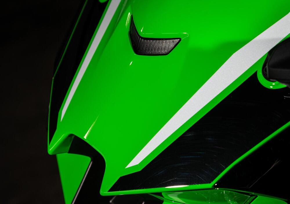 Facciamo però un passo indietro: vediamo cosa è cambiato sulla supersportiva Kawasaki. Il primo aspetto che balza all’occhio è ovviamente il pacchetto aerodinamico, con alette integrate nella carenatura sotto i gruppi ottici, che convogliano il flusso d'aria e determinano un aumento del carico aerodinamico di circa il 17% in più rispetto a quello della precedente Ninja. Che non aveva appendici aerodinamiche, direte voi, ma in realtà la forma del cupolino era stata comunque studiata per generare deportanza, sia pure in maniera meno evidente.