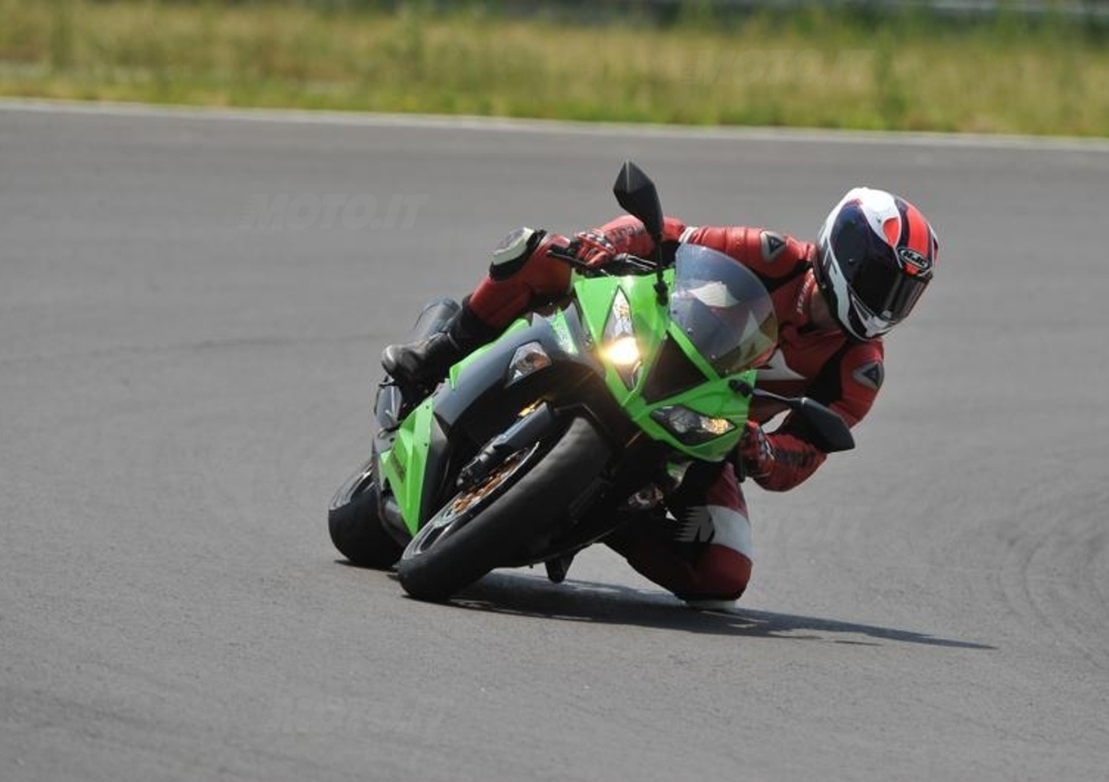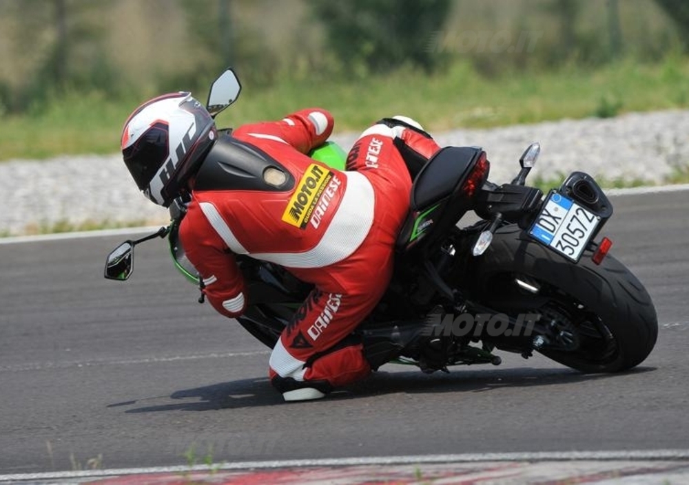 Non sarà rapida come alcune concorrenti nei cambi di direzione, in conpenso si dimostra davvero stabile e con degli appoggi sicuri in percorrenza di curva. Le Bridgestone S20 di primo equipaggiamento si comportano degnamente, ma le prestazioni della Ninja meriterebbero pneumatici specifici per l'uso pistaiolo, anche perché con le temperature elevate (oltre 30°) che ci accompagnano durante la giornata, sono decisamente impegnative per un pneumatico pensato anche per l'utilizzo stradale.