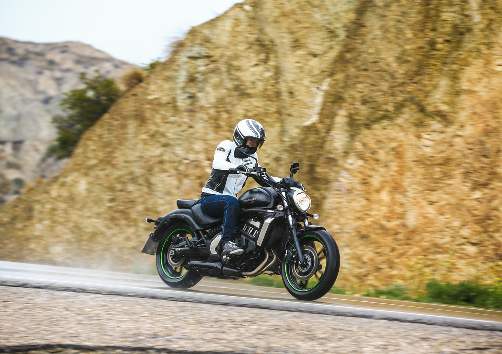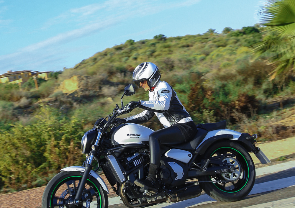 Il primo tratto del nostro test si svolge sulle splendide alture che svettano a picco sulla costa andalusa, quindi un bel percorso montano, fatto di ampi tornanti e curve veloci. Non il terreno ideale per una piccola custom che si propone, tra l’altro, principalmente per un utilizzo urbano. Anche la lunghezza dell'interasse non è dalla sua e ci fa pensare che non sarà così semplice farle disegnare a dovere le curve (bagnate!) della strada che ci para dinnanzi. Niente di più sbagliato: anche in questo caso la Vulcan ci stupisce per la maneggevolezza e per la disinvoltura con cui affronta saliscendi tortuosi, con una buona luce a terra e forte di una gommatura che ben si comporta anche sull’asfalto scivoloso. Non ci stanchiamo di dirlo: sempre gradito l’ABS, per nulla invadente ma utile tanto in città quanto in situazioni meno urban come quella teatro della nostra prova. A proposito dell’impianto frenante, da segnalare la perfetta modulabilità dell’anteriore contro un posteriore un po’ spugnoso e blando nel primo tratto di corsa del pedale. Altra lode doverosa va alla leva della frizione, regolabile e morbidissima, complice di un cambio per nulla rumoroso, dolce e preciso negli innesti.