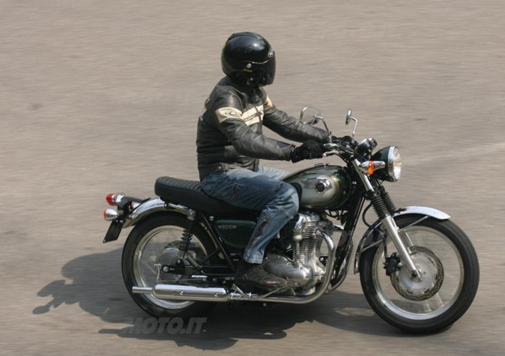 La forcella con steli da 39 mm e i due ammortizzatori (regolabili su 5 posizioni nel precarico) non tradiscono le aspettative, e copiano con sufficiente cura le imperfezioni dell'asfalto. Quando le buche sono troppo profonde, ci pensa il sellone super imbottito a proteggere la nostra schiena. Il rendimento del freno anteriore è onesto, senza infamia e senza lode: discreta la potenza, buona la modulabilità. Una bella promozione va al tamburo, che invece eccelle nella precisione di intervento. Arriva al bloccaggio solo se davvero lo si vuole, ma che senso ha guidare così la bella W800?