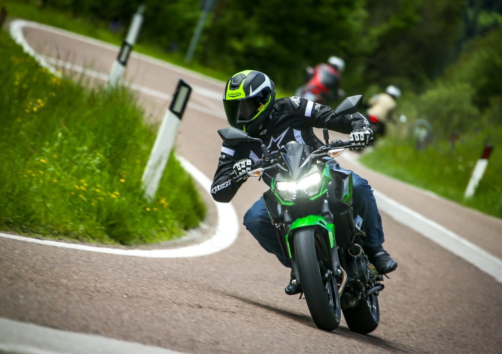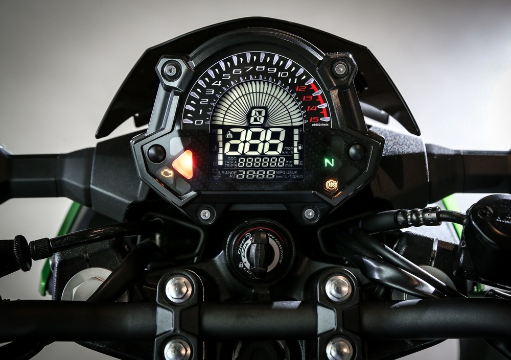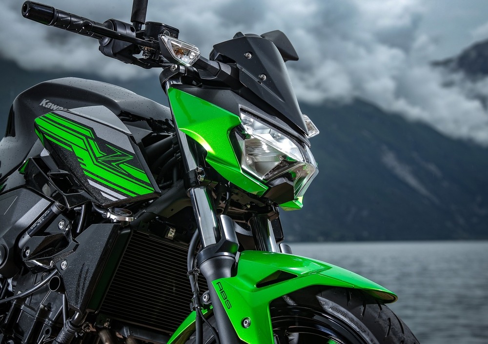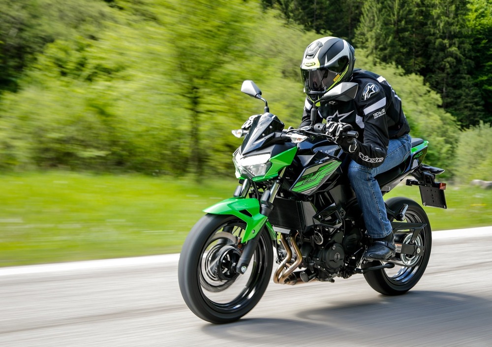 Rispetto al passato cambia notevolmente l’estetica: prima di tutto, il codino è in linea con i modelli più attuali della gamma Kawasaki e ingloba un faro a LED. Guardandola da davanti, invece, risalta il nuovo gruppo ottico (sempre a LED), meno spigoloso rispetto alla Z300 ma con un design affilato, soprattutto se visto di profilo. Novità anche i fianchetti, che si estendono solo nella parte alta della moto lasciando ben in vista il propulsore. I tecnici giapponesi hanno pensato anche all’ergonomia: la sella rimane a 785 mm da terra, ma è più stretta di 30 mm e l’imbottitura è ora di 90 mm (contro i 50 mm del modello passato). Inoltre, debutta un nuovo cruscotto, derivato dalla sorella maggiore Z650: misto analogico (per i giri motore) e digitale LCD dove si possono leggere numerose informazioni come la velocità, i trip, i consumi, la marcia inserita, l’ora, il livello del carburante e la temperatura dell’acqua. Rispetto alla naked di cilindrata superiore manca la funzione di shift-up, che suggerisce il momento migliore per salire di marcia.