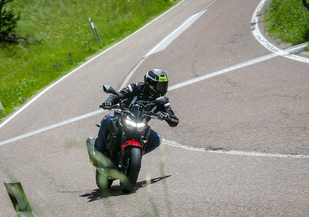 Rispetto alla sorella carenata, la posizione di guida permette di guidare con la schiena dritta (merito del manubrio più alto di 50 mm), così che il peso venga scaricato sulla sella con imbottitura maggiorata. I tecnici giapponesi hanno pensato a una naked adatta ad ogni genere di motociclista: l’altezza della sella è di 785 mm, ma la distanza con le pedane obbliga a tenere le gambe rannicchiate a chi, come chi scrive, è sopra il metro e ottanta. Spilungoni, però, non preoccupatevi: Kawasaki ha già pronta una ricca gamma accessori che comprende anche una sella più alta di 3 cm. Il propulsore trasmette qualche leggera vibrazione su pedane e serbatoio a seconda del numero di giri, ma non ci sentiamo di metterlo tra i difetti: infatti, danno carattere alla Z400, che trasmette la sua anima a chi guida.