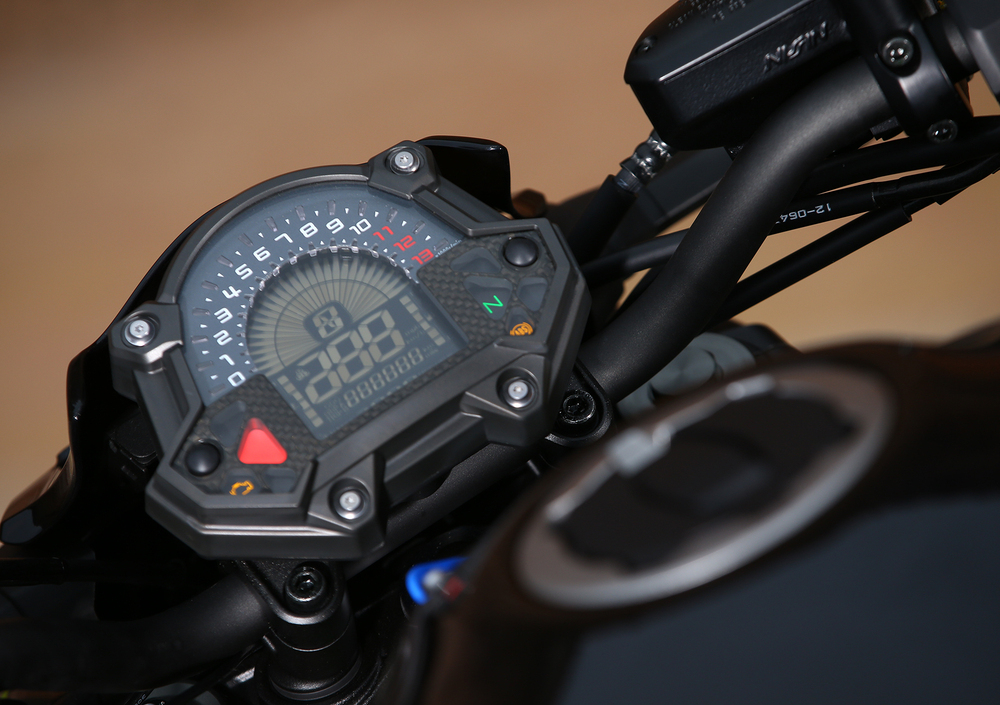 Non manca il classico indicatore Eco di Kawasaki, che segnala quando si sta consumando meno, e questo in base a regime di giri e apertura dell'acceleratore. Il contagiri è integrato dalle spie di cambiata, che sono programmabili nell'accensione al regime preferito ed escludibili.