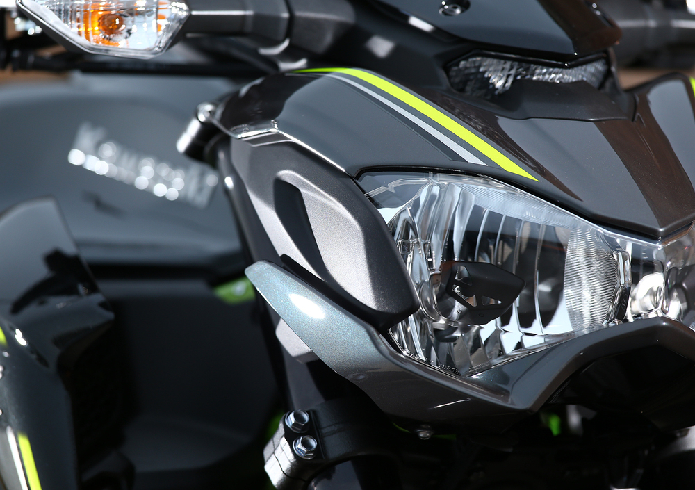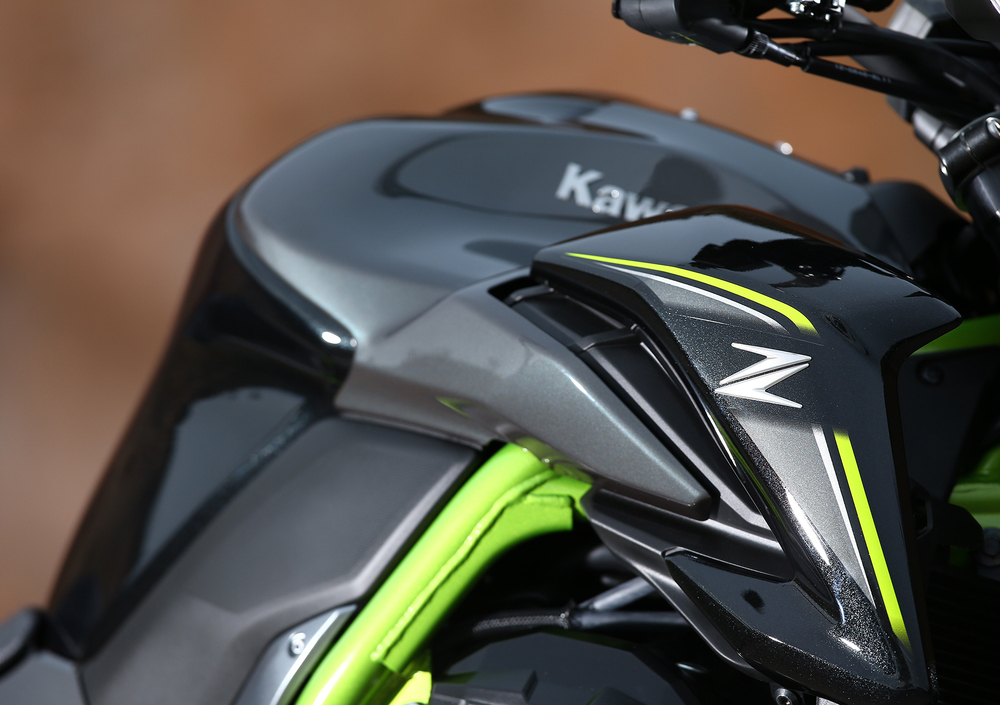 Lo stile è inconfondibilmente quello delle ultime naked Kawasaki, più moderno e dinamico rispetto alla Z800 e meno muscoloso nei confronti dell'iper naked Z1000. Il tipico doppio faro – stavolta con luce di posizione separata - montato basso e proteso in avanti, è l'elemento distintivo di un design che gioca con linee svelte e caricate sull'avantreno. Piace molto la maggiore essenzialità rispetto alla 800, il minore ricorso a coperture plastiche non sempre giustificate, così come l'idea di lasciare parzialmente in vista il nuovo telaio. Che è verniciato di verde in una delle tre versioni di colore metallizzato disponibili: l'antracite/nero; le altre due sono a base nera e bicolore nero-verde.