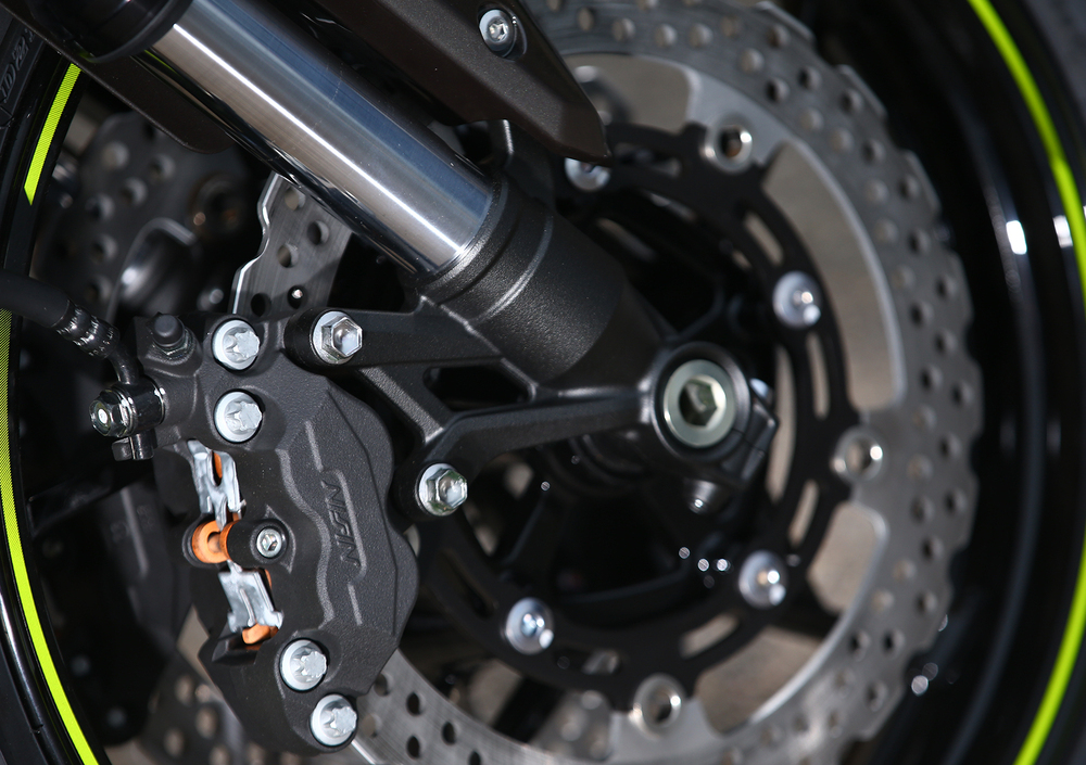 Come da tradizione sulla serie Z, i dischi freno hanno il profilo a margherita; sulla nuova 900 la coppia anteriore misura 300 mm (erano da 310 sulla 800) e da 250 mm è il singolo posteriore. Le pinze anteriori ad attacco tradizionale, marcate Nissin così come l'unità di controllo dell'ABS, sono a quattro pistoncini. Sono di aspetto leggero anche le ruote a cinque sottili razze tangenziali, da 17 pollici, che montano le Dunlop Sportmax D214 radiali 120/70 e 180/55.