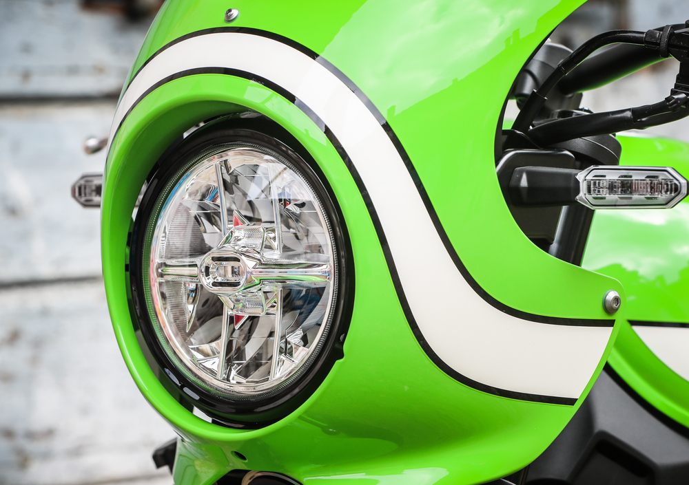 Vediamo invece quali sono le particolarità della Z900RS CAFE. Esteticamente le sovrastrutture sono le stesse della RS, mentre la colorazione verde lime originale e la fascia bianca sono un omaggio alla Z1000R del 1982, quella pubblicizzata da Eddie Lawson che proprio con la Z1000 (all’epoca senza cupolino!) vinse il campionato AMA Superbike nel biennio ‘81-‘82.