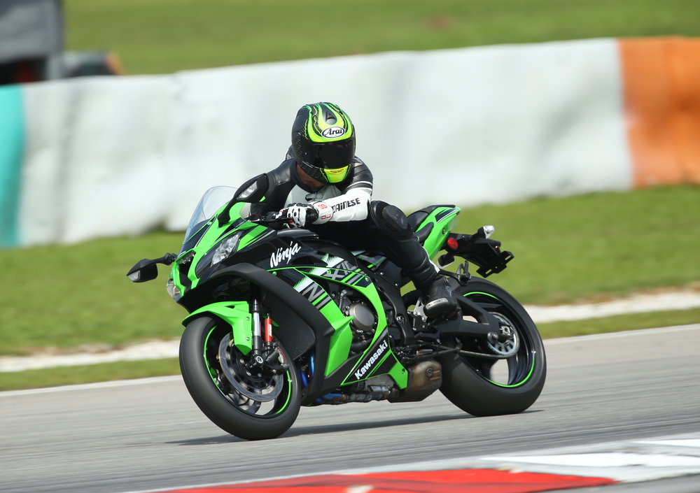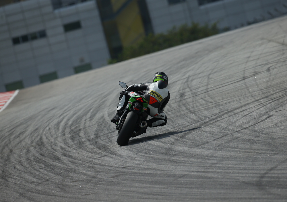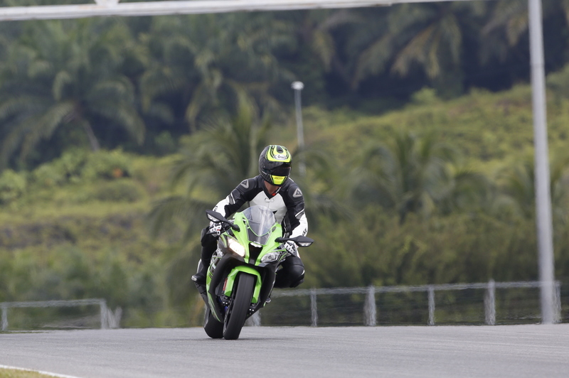 La ZX-10R in tenuta pistaiola appare ancora più leggera e rapida nei cambi di direzione, con l'avantreno ben piazzato e preciso, anche quando si riprende in mano il gas dopo i tornanti da prima di Sepang. In questo frangente ci accorgiamo dei miglioramenti apportati alla posizione di guida, che sul precedente modello soffriva per un posizionamento forse un po' avanzato delle pedane. Il fatto di trovarsi con i semi manubri più vicini e con le pedane più arretrate aiuta a contrastare la spinta del quattro cilindri che in questa configurazione eroga oltre 210 cv