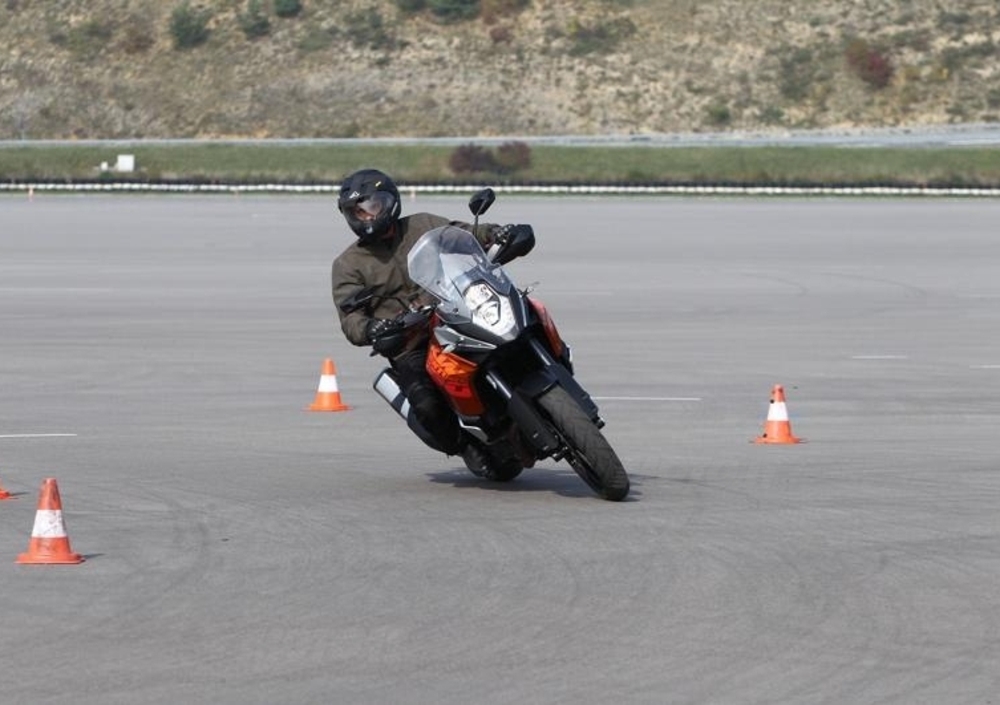 Ancora più sconcertante è la rapidità con cui si prende confidenza con il sistema arrivando a darlo quasi per scontato: la resistenza iniziale dovuta all’istinto si stempera rapidamente, e la manovra diventa istintiva così come prima lo era modulare con grande cautela il freno anteriore. Un comportamento che sulla prova successiva porta a verificare quanta sia, in realtà, l’aderenza disponibile con gli pneumatici e le ciclistiche odierne anche a moto inclinata. Il test prevede l’inserimento a velocità controllata in una curva fra i birilli, all’interno della quale pinzare sull’anteriore fino a fermarsi.
