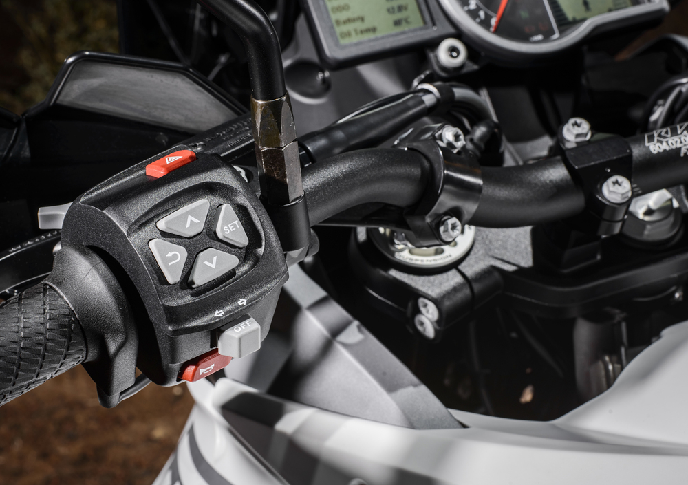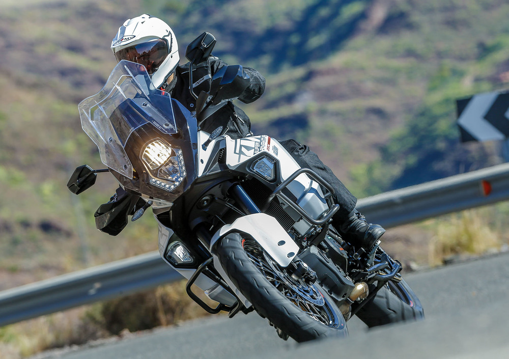 La KTM 1290 Super Adventure è una moto di lusso, non ci piove. Non fa sognare le chilometriche derapate su terra della Adventure R, ma viaggi in business class accompagnati dalle prestazioni esagerate del bicilindrico che tocca qui quota 1.301 cc. Rispetto al 1190 crescono sia l'alesaggio che la corsa, l'albero motore è più pesante e la sesta marcia è molto lunga per consentire medie autostradali elevate a bassi regimi. Ci sono anche nuove teste e camere di combustione riviste. Il tutto porta a una potenza di 160 cavalli a 8.750 giri, con una coppia di 140 Nm a 6.750 giri, ma pensate che a 2.500 giri si hanno già oltre 10 chilogrammetri a disposizione. L’elettronica integra quella della 1190 con ulteriori innovazioni. Troviamo i riding mode (sport, street, rain, offroad) per il motore, il controllo di stabilità MSC che lavora con l'ABS e il controllo di trazione MTC; in più ci sono anche il cruise control, il sensore della pressione delle gomme e soprattutto le sospensioni WP semi-attive e i fari a LED adattivi, capaci di orientarsi in direzione della curva. Quando la moto si inclina di 10°, si accende un LED; a 20° due LED e a 30° la parte interna della curva è illuminata da tutti e tre i LED.