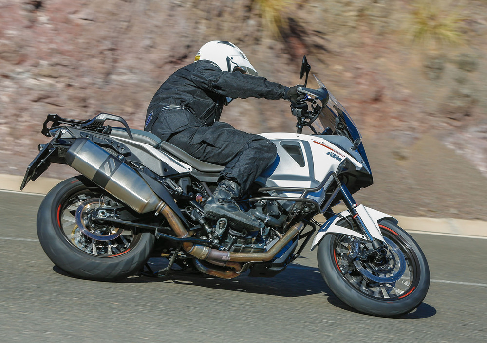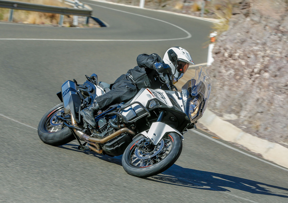 Non abbiamo ancora smaltito la sbornia del recente comunicato stampa della KTM sui numeri del 2014, chiuso con quasi 160.000 moto vendute, che siamo qui al sole delle Canarie a raccontarvi come si comporta la nuova ammiraglia della Casa austriaca. Ci pareva già un gran bel prodotto la 1190 Adventure, che infatti resta a listino e anzi continuerà a essere il cavallo di battaglia della famiglia Adventure grazie a un equipaggiamento notevole (150 cavalli, sospensioni elettroniche, riding mode, controllo di stabilità MSC e molto altro ancora). A lei e alla 1190 Adventure R con cerchio anteriore da 21" nel 2015 si affiancano altre due versioni: la 1050 Adventure (a 13.150 euro), di cui troverete presto la prova online, e la 1290 Super Adventure. Sarà venduta nella colorazione bianca che vedete nelle nostre foto al prezzo di 18.450 euro con una dotazione di serie molto completa, che sotto diversi aspetti fa di lei un punto di riferimento nella categoria delle maxi enduro più lussuose e prestazionali. L'autonomia bestiale (garantita dai 30 litri del serbatoio) la pone in concorrenza a muso duro con un'altra Adventure, la BMW R1200GS. Rispetto a questa però la KTM vanta una dotazione di serie più ricca (ci sono le sospensioni semi attive, la sella e le manopole riscaldate, il controllo di stabilità, i fari adattivi in curva). La potenza esagerata di 160 cavalli la mette invece sullo stesso, incredibile piano prestazionale della nuova Ducati Multistrada, che vanta in effetti la medesima cavalleria.