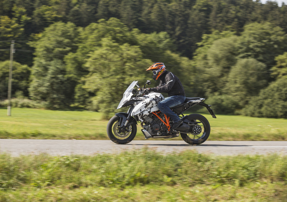 L’oggetto del mistero si chiama 1290 Super Duke GT e sarà presentato a EICMA 2015, salvo arrivare presso i concessionari nella primavera del 2016. Della sua esistenza si vociferava già da alcuni mesi, ora possiamo dirvi molto di più: com’è fatta e come va. Davanti a noi si presenta in una veste quasi definitiva. Mancano giusto gli ultimi affinamenti alle mappe e il nostro prototipo ha alcune assistenze alla guida disinserite (l’MSR che aiuta a gestire il freno motore in scalata e il cambio elettroassistito sono spenti, come pure il controllo di stabilità in curva denominato MSC). Della livrea vi sarete già accorti da soli: la nostra 1290 GT è camuffata dal solito wrapping bianco e nero, che cerca di dissimulare le forme e che è tanto diffuso nel mondo dei prototipi a quattro ruote.