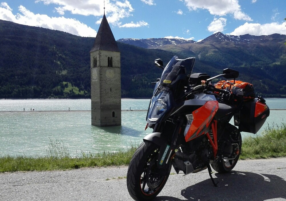 Il tempo di riempire lo zaino e siamo partiti, accompagnati da un cielo terso e temperature ideali. Il giorno infrasettimanale ci ha regalato strade con poco traffico e tornanti liberi da orde di camper e turisti del weekend. Lo Stelvio, la Val Venosta e il Lago di Resia sono percorsi ideali per le gite in moto e si sono rivelati perfetti anche per la KTM 1290 Super Duke GT (vi invitiamo a rileggere la nostra prova, o a guardare sempre il video sopra, per scoprire come va o com'è fatta).