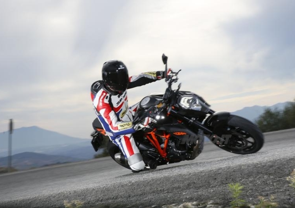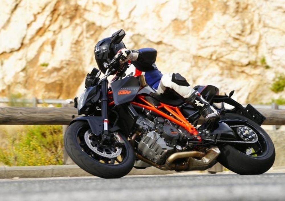 Ma analizziamo i numeri della KTM 1290 Super Duke R, iniziando dal motore. Il bicilindrico da 1.301 cc deriva da quello che equipaggia la RC8 e l’Adventure 1190, che però arriva a 1.195 cc, l'incremento è stato ottenuto aumentando l'alesaggio da 105 a 108 mm con la corsa che passa da 69 a 71 mm. Aumentano anche i diametri dei corpi farfallati che crescono da 52 a 56 mm, mentre scende il peso dei pistoni di 47 grammi, pur avendo un diametro superiore di 3 mm. Anche l'albero motore è completamente nuovo e la sua leggerezza contribuisce alle incrementate prestazioni in termini di risposta alle aperture del gas. L'affinamento della logica di funzionamento del ride-by-wire che lavora in simbiosi con la gestione elettronica Keihin del bicilindrico, se da una parte ha permesso il raggiungimento di prestazioni al top della categoria (questo motore è il più potente nel settore delle naked sportive), dall'altra ha consentito un deciso miglioramento dei consumi, che grazie ai 18 litri di serbatoio, consentono un'autonomia di tutto rispetto. L'esasperazione delle prestazioni non ha però avuto ripercussioni sugli interventi di manutenzione, che sono previsti ogni 15,000 km.