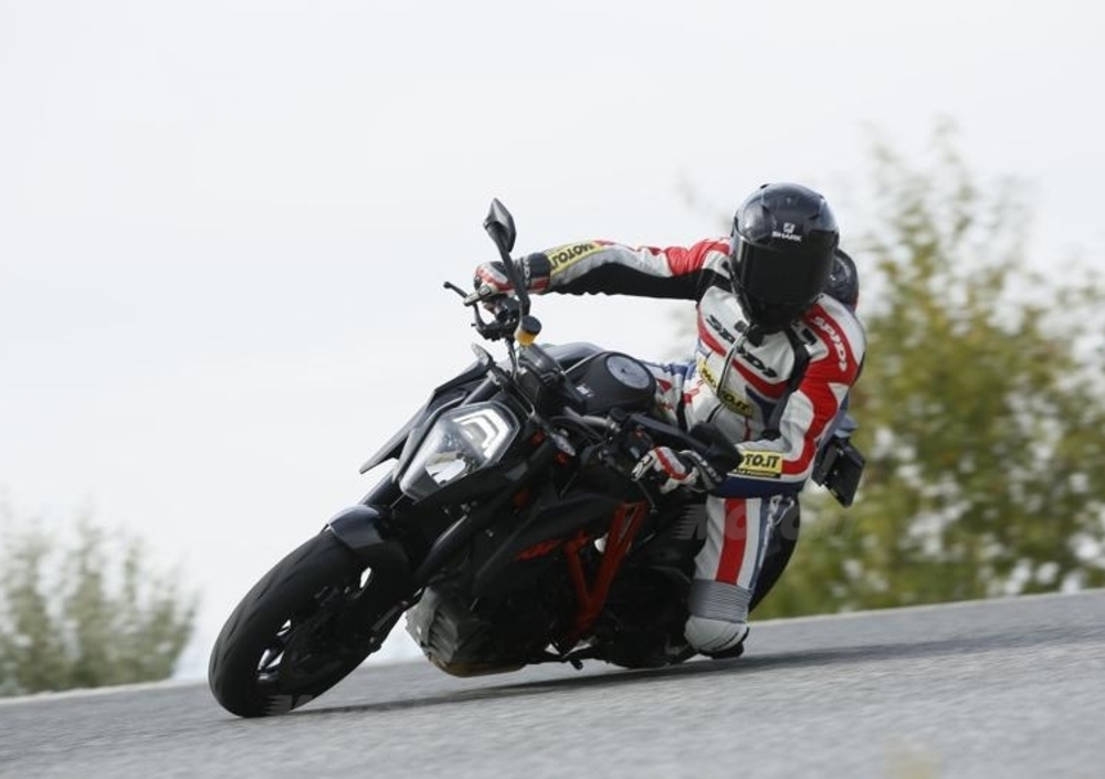 Dopo che ci hanno ricordato innumerevoli volte che i pneumatici posteriori sono nuovi (in primo equipaggiamento sono montati i nuovi Dunlop SportSmart²), perché nei due giorni precedenti una serie di colleghi li ha letteralmente “stracciati” nel test su strada e in pista, partiamo con il massimo della cautela. Ci ritroviamo su quella che può essere considerata una superstrada, e a mano a mano che passano i chilometri, siamo sempre più confusi. Confusi dalla facilità con cui stiamo portando in giro un allevamento di cavalli degno di un ranch in Texas. Tralasciamo che stiamo viaggiando in sesta marcia a 130 km/h e il bicilindrico trotterella a circa tremila giri (!), e soprassediamo sul fatto che ad ogni variazione di inclinazione del polso destro corrisponda una ripresa vigorosa, il fatto è che la Super Duke 1290 si guida con naturalezza, e il suo motore se non viene sollecitato, è davvero godibile.