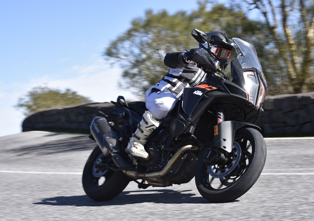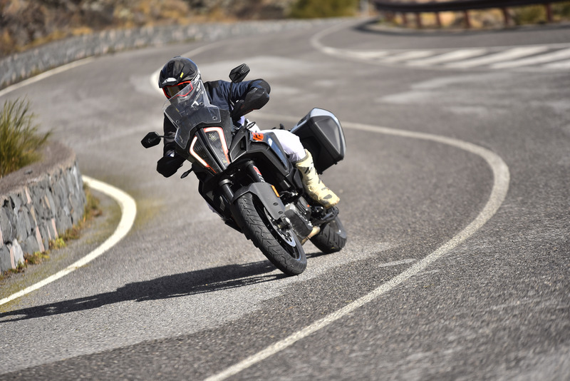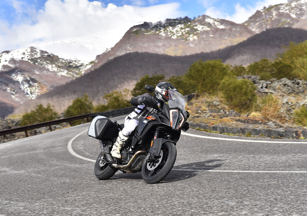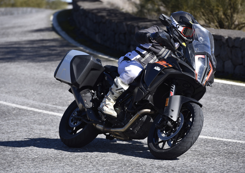 Bisogna però uscire dalla città per godere come dei ricci. Mettiamo le sospensioni e il motore su sport e scopriamo l'altro volto della SuperAdventure S. La crescita di giri a partire dai 4.000 è furibonda e non ne vuole sapere di arrestarsi fino a 9.000 giri. Le accelerazioni sono impressionanti grazie anche alla perfetta taratura del cambio ad assistenza elettronica (optional). Il motore della KTM si pone ai vertici della categoria per le sue prestazioni complessive. BMW è più regolare sotto e Ducati ha più allungo in alto, ma la botta ai medi del V2 austriaco è da infarto. Tutto questo Bengodi non deve spaventare, perché la gestione della potenza è resa di una semplicità disarmante dai controlli elettronici e dalla bontà della ciclistica. Le sospensioni azzerano ogni fenomeno di beccheggio e lavorano in perfetta sintonia con le nuove scarpe Pirelli. Con la 1290 si piega forte, c'è tanta luce a terra. E si frena altrettanto forte, grazie all'ottimo impianto Brembo.