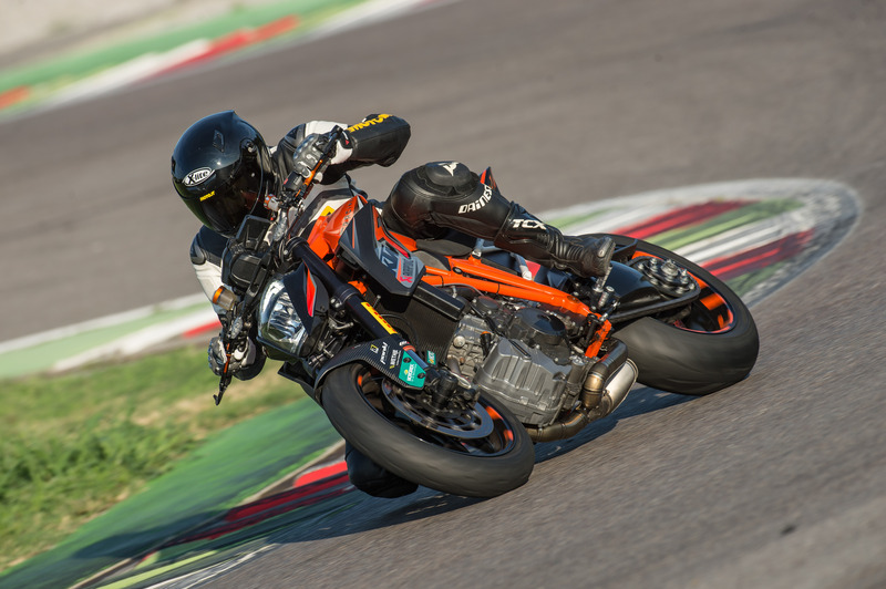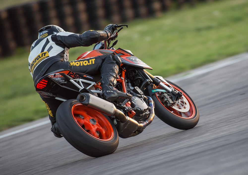 La guida resta precisa e molto appagante grazie anche alle gomme Pirelli Supercorsa montate durante il test. Abbiamo usato anche un treno di Diablo Rosso 3, che hanno retto bene alla vagonata di coppia della moto. Arnaldo Nicoli (responsabile dell’Assistenza di KTM Italia) si è limitato a indurire la sospensione posteriore, frenando il ritorno idraulico. Con questa piccola accortezza la KTM 1290 Super Duke R, che nasce per la strada, si è comportata egregiamente anche a Franciacorta. È rapida a scendere in piega e fedele nel mantenere la traiettoria. In uscita c’è tanta trazione, ma l’avantreno si alleggerisce e tende ad allargare. Difficile dargli torto, quando si ha a che fare con oltre 190 cavalli per 190 kg.
