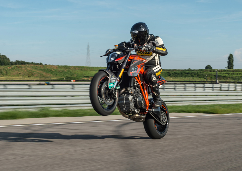 Non sappiamo dirvi se i 195 cavalli siano veri o no. Possiamo però testimoniare la forza brutale, spaventosa di questo bicilindrico. La ciclistica sana del telaio a traliccio e l’elettronica puntuale (non abbiamo pensato un istante di disinserirla) rendono la KTM 1290 Super Duke R una bestia ben gestibile in circuito. Resta però il fatto che la moto austriaca si beve i rettilinei con una foga difficilmente riscontrabile su altre moto. Il motore ha infatti un risposta rabbiosa che lascia galleggiare la ruota davanti per tutta la durata dei tratti diritti. Non c’è il cambio elettronico e a ogni cambiata la ruota anteriore tende ad alzarsi, salvo essere riportata subito a terra dall’anti wheeling. Questo avviene persino nel passaggio quarta-quinta! Impressionante.