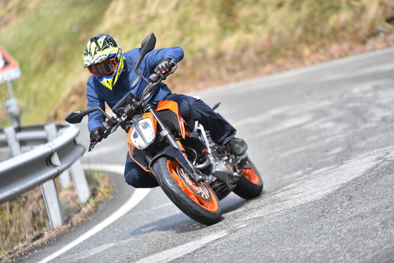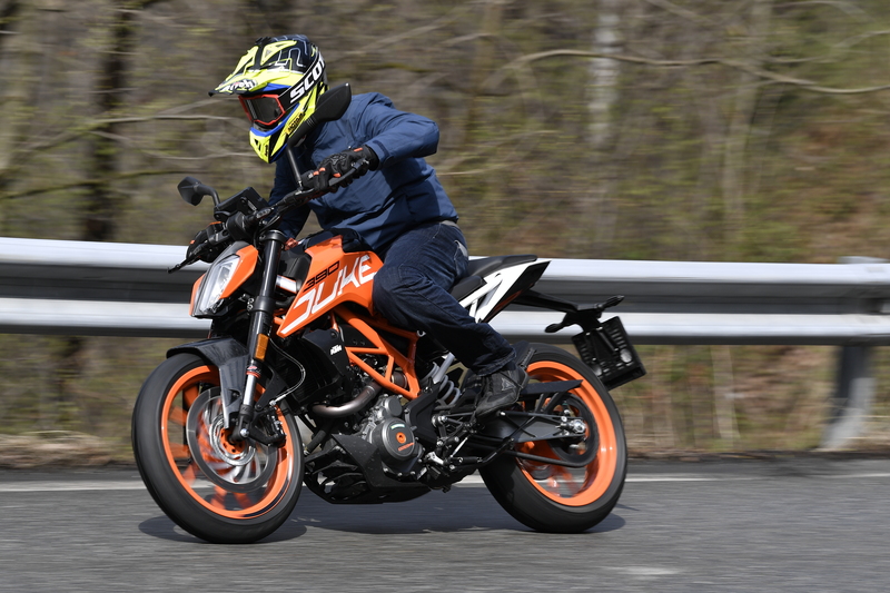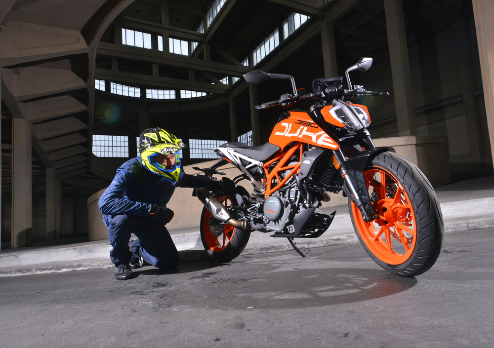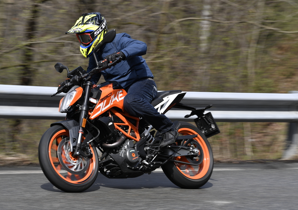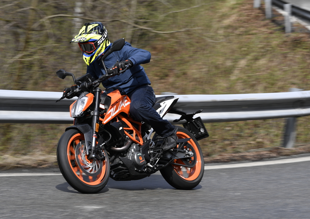 La 390 Duke mostra un'ottima abitabilità anche per i piloti di alta statura, ma non deve spaventare i giovani bikers meno alti. La sella è infatti bassa e il peso ferma l'ago della bilancia a 149 kg. Il passeggero ha uno spazio più che sufficiente per gli spostamenti in città o per le gite e medio/breve raggio, mentre il vano sotto sella è decisamente ridotto. Si apprezzano le ottime finiture e la completezza della strumentazione TFT, che si legge con grande chiarezza sia col sole che al buio (cambia infatti lo sfondo). Il motore Euro 4 non ha perso la brillantezza del modello precedente, è anzi migliorato più di quanto ci aspettassimo. E' sparito il leggero effetto on-off e c'è più coppia ai medi regimi. Il risultato è un mono sportivo, che riprende bene da 3.000 giri e mostra una coppia già gustosa dai 5 ai 7.000 giri. Ma non si ferma certo qua. Allunga forte fino a 10.000 giri ed è servito da un cambio rapido e preciso, anche se un pelo corto nei rapporti. A 130 il motore gira a circa 8.000 giri e la velocità massima reale supera di poco i 170. Sono prestazioni ragguardevoli, che si sposano con un ottimo comportamento del telaio, agile e preciso anche alle alte velocità, e con sospensioni che danno più sostegno sulle buche e in frenata. Alla Duke 390 va il primato in agilità tra le curve. E' la moto perfetta per scoprire l'universo delle due ruote, ma non manca di dare belle soddisfazioni anche ai piloti più scafati. E' anche molto sicura, perché il nuovo impianto sviluppato con Brembo è instancabile e con la giusta modulabilità. Difetti? Ai regimi più bassi è comparsa una risonanza del motore (inavvertibile sulle Duke dell'anno scorso), probabilmente dovuta al nuovo scarico; agli alti regimi (sopra gli 8.000) si avvertono vibrazioni ad alta frequenza sulle pedane. Nulla che però faccia venir meno il divertimento in sella alla nuova 390 Duke, che ci strappa un pollice alzato anche alla voce dei consumi. Con un litro non è difficile avvicinarsi ai 30 km percorsi fuori città.