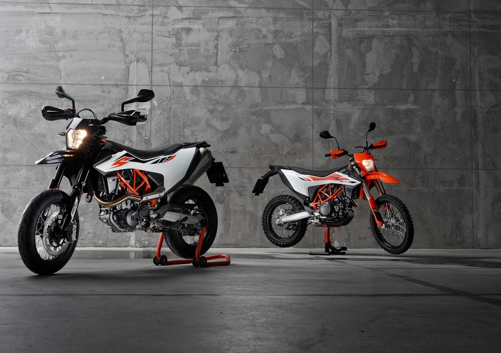 Al Salone di Milano hanno debuttato un po' a sorpresa le nuovissime KTM 690 Enduro R e 690 SMC R (da supermotard), entrambe dotate dell'ultima evoluzione del propulsore monocilindrico LC4. Rappresenta oggi lo stato dell'arte tra i grossi mono omologati per l'uso stradale, è stato affinato costantemente nel corso degli anni fino a raggiungere un altissimo livello prestazionale, unito a una buona fruibilità nella guida di tutti i giorni. In particolare la versione Enduro è ancora oggi apprezzata e comprata da chi sogna la cara, vecchia dual sport. La moto con cui fare tutto insomma, senza costosi carrelli o furgoni per raggiungere l'ambito tracciato in fuoristrada. Non è una moto da enduro racing, ma affronta tranquillamente i percorsi impegnativi (ecco, magari evitate l'hard tanto di moda!). Lo stesso vale per la motardona 690 SMC R, una delle pochissime supermoto monocilindriche nate e progettate per la strada e non solo per i cordoli.
