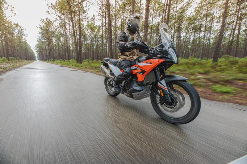 Su strada emerge prepotente il grande lavoro fatto sul motore e sulla ciclistica per definire una moto capace di viaggiare ma anche di divertire sul misto e di non fermarsi quando l'asfalto finisce. A dispetto della ruota anteriore da 21 pollici e di una sezione da 90 mm, nelle curve l'anteriore regala un ottimo appoggio, con il posteriore che segue perfettamente e con sincerità la traiettoria. Ottime le gomme di primo equipaggiamento, cui va fatto un plauso per la resa sull'asfalto bagnato dove hanno contribuito alla notevole comunicativa di guida della 890 Adventure, che anche sotto il diluvio è rimasta sicura, stabile e godibile.