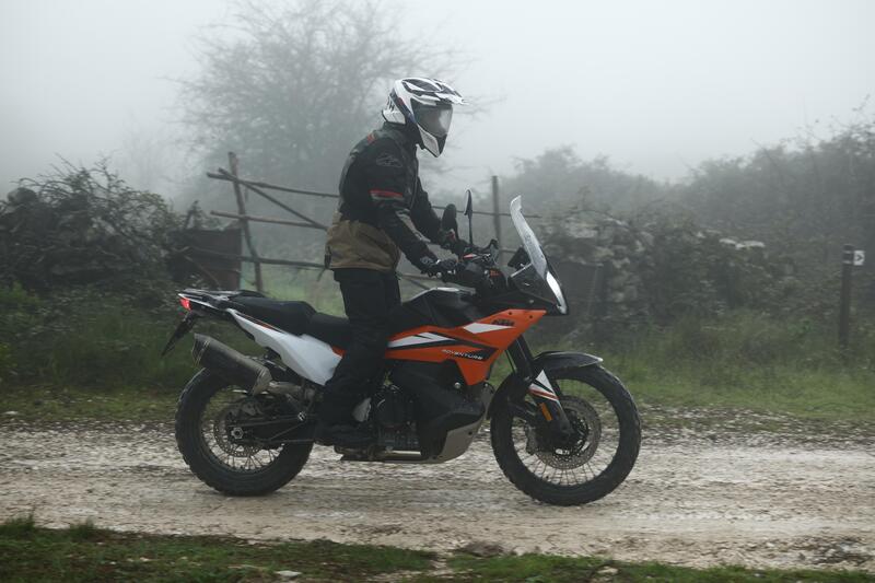 Le sospensioni sanno essere controllate sul misto ma allo stesso tempo garantiscono un buon comfort di guida già nella taratura standard, mentre in fuoristrada per metterle in crisi ci vuole un pilota molto più aggressivo di questo tester. Chi scrive ammette senza problemi di appartenere a quell'utenza che non ha nel DNA il tassello ma - proprio per questo - di avere ancora di più apprezzato la comunicativa di guida della Adventure anche sugli sterrati bagnati, sul sottobosco scivoloso come sapone o sulla sabbia, tutte situazioni che potrebbero impensierire chi non è avvezzo al fuoristrada con una maxienduro. La moto austriaca in questo ha dimostrato di avere aumentato ulteriormente il proprio range di utilizzo e la propria accessibilità, senza avere perso un millimetro sul fronte dell'aggressività quando condotta da un vero fuoristradista.