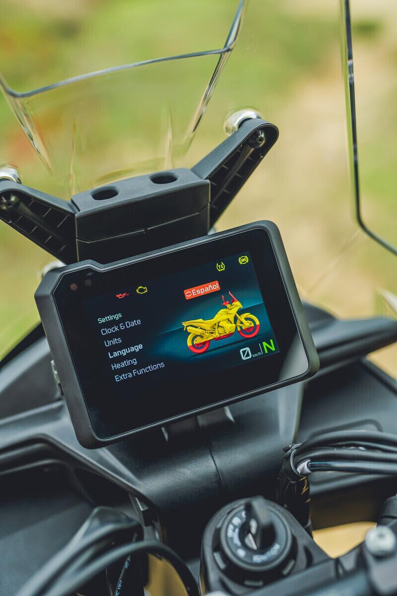 Passando dalle parti del manubrio notiamo subito che accanto alle leve (regolabili) di freno e frizione troviamo adesso il pulsante per il lampeggio di emergenza e, al centro, il dashboard TFT da 5 pollici che presenta un'interfaccia a pittogrammi per assicurare la perfetta lettura delle informazioni al primo colpo d'occhio e anche per consentire di capire immediatamente l'effetto delle regolazioni sulle quali si desidera intervenire.