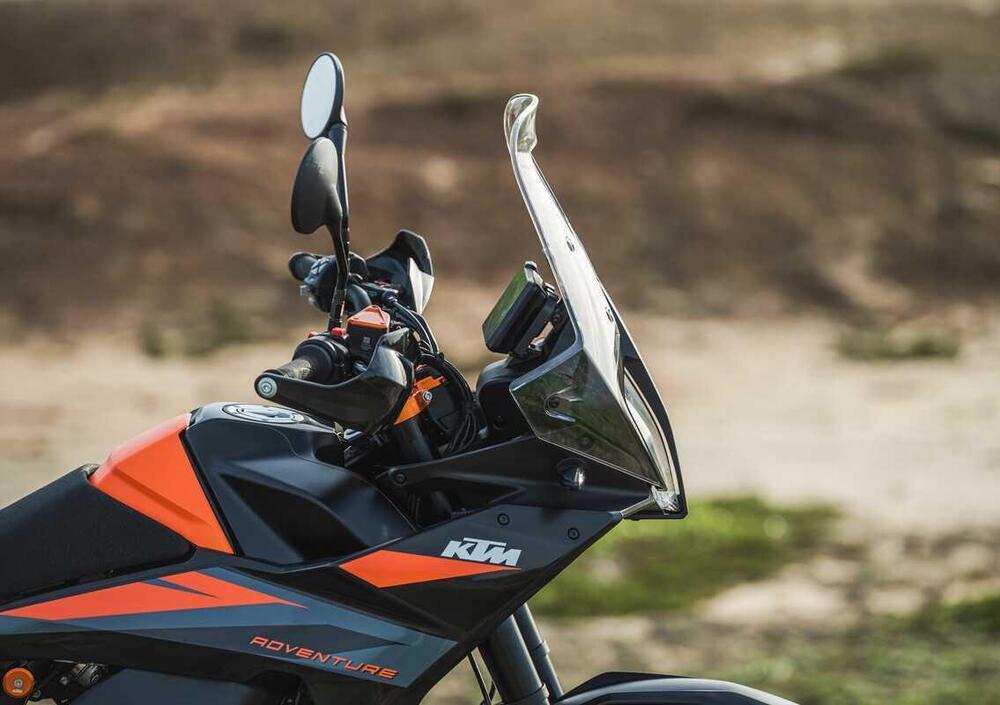 Ma non è tutto: cambiano i due supporti in alluminio pressofuso del cupolino, adesso più robusti, e cambia il plexi (fisso e non regolabile): più alto, più largo e con un evidente asola al centro per scongiurare la formazione di fastidiose turbolenze in zona casco e busto. Nuova è anche la sella dalla diversa consistenza del materiale di seduta: la sua altezza da terra è regolabile molto velocemente su 840 o 860 mm ma è disponibile un kit per arrivare a 825 mm e in ogni caso il catalogo Power Parts (gli accessori originali KTM) prevede selle singole da 825 e 865 mm e la sella riscadabile da 850 o 830 mm.