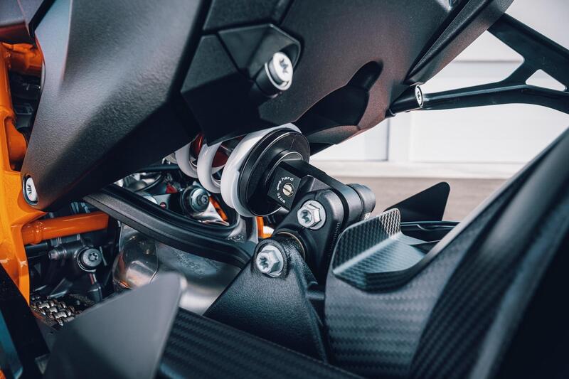 Arriva anche un nuovo sistema di leveraggi per la sospensione posteriore, per ora esclusivo della 990 RC R, ma che vedremo più avanti anche sulla 990 Duke R.