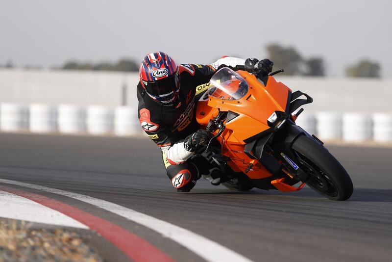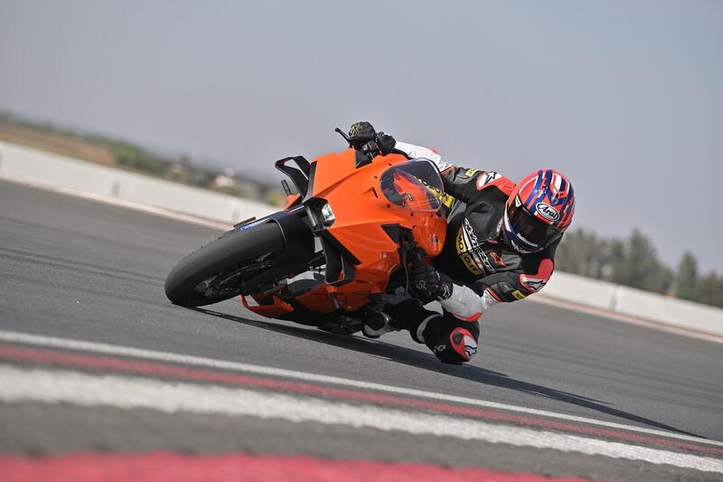 Le condizioni dell'asfalto non proprio ottimali, a causa di un velo di sabbia che è svanito solo dopo qualche turno e solo in traiettoria, sulle prime ci ha messo un filo di apprensione addosso, ma bisogna dire che la 990 RC R ci ha messo del suo per non fare salire la tensione. L'equilibrio emerso durante il test in strada viene confermato anche tra i cordoli. Ben bilanciata e con una distribuzione dei pesi che predilige solo per il 2% l'anteriore, rendono la supersport KTM intuitiva e facile. Non c'è nulla da "interpretare", è trasparente sotto ogni punto di vista, rapida e precisa a scendere in piega, controllata in percorrenza e pronta in uscita! Non riesco a trovare punti deboli nella sua dinamica, e anche il motore, con i suoi 103 Nm di coppia, riesce a farti divertire senza mai farti sentire "inadatto" come accade con alcuen SBK da 220 CV. Qui il gas lo si da tutto, e l'autostima ne guadagna.