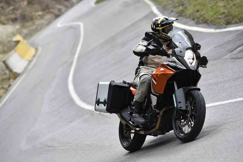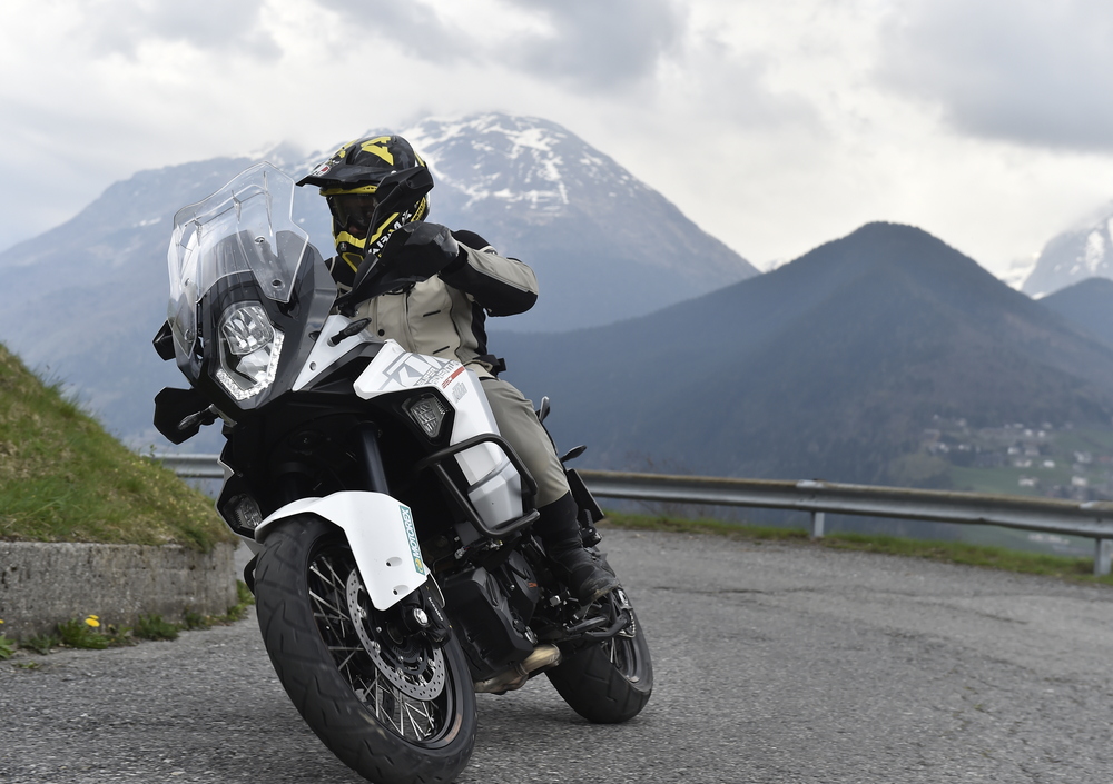 Divide con la 1190 telaio e forcellone. Il resto è inedito. A partire dal serbatoio maxi, da ben 30 litri. Le sovrastrutture danno una protezione migliore alle alte velocità e, in ottica turistica, troviamo una dotazione di serie molto ricca. Ci sono le sospensioni semi attive elettroniche WP, la sella e le manopole riscaldate, il controllo di stabilità, i fari adattivi in curva e il parabrezza regolabile. La potenza di 160 cavalli è quasi da record. Diciamo quasi, perché al suo livello tra le bicilindriche c’è solo la Ducati Multistrada 1200. Il motore di 1.301 cc dispone di 160 cavalli a soli 8.750 giri, con una coppia di 140 Nm a 6.750 giri, ma pensate che a 2.500 giri si hanno già oltre 10 chilogrammetri a disposizione. L’elettronica integra quella della 1190 con ulteriori innovazioni. Troviamo i riding mode (sport, street, rain, offroad) per il motore, il controllo di stabilità MSC che lavora con l'ABS e il controllo di trazione MTC; in più ci sono anche il cruise control, il sensore della pressione delle gomme e soprattutto le sospensioni WP semi-attive e i fari a LED adattivi, capaci di orientarsi in direzione della curva. Quando la moto si inclina di 10°, si accende un LED; a 20° due LED e a 30° la parte interna della curva è illuminata da tutti e tre i LED. Sono invece optional l’assistenza alla partenza in salita e il sistema MSR che apre leggermente le farfalle e aumenta la coppia per contrastare la tendenza al bloccaggio della ruota quando si inserisce un rapporto troppo basso. In pratica agisce come un controllo di trazione, ma al contrario. Il peso senza carburante è di 229 kg, col pieno non supera i 250 kg. Le sospensioni sono semi attive, capaci cioè di adattarsi autonomamente allo stile di guida e alle condizioni della strada. Il pilota deve solo settare il precarico e il damping mode preferito in base ai suoi gusti (street, sport, confort, offroad); la centralina provvede poi in tempo reale a regolare la risposta idraulica della forcella da 48 mm e del mono, entrambi con 200 mm di escursione. La 1290 Super Adventure adotta i cerchi a raggi della 1190 di tipo tubeless con pneumatici Continental Trail Attack 2 nelle misure 120/70-19 e 170/60-17. La frizione impiega una pompa idraulica Magura, mentre i freni sono marchiati Brembo. Davanti lavora la pompa radiale sulle pinze (anch'esse radiali) a quattro pistoncini, i dischi sono da 320 mm (267 dietro).