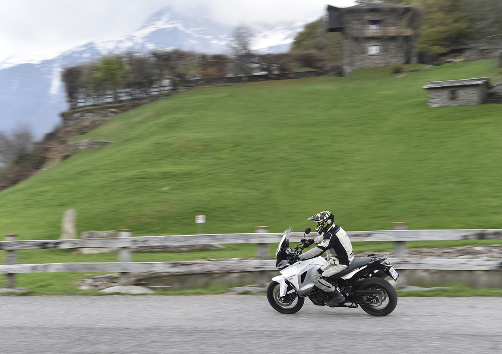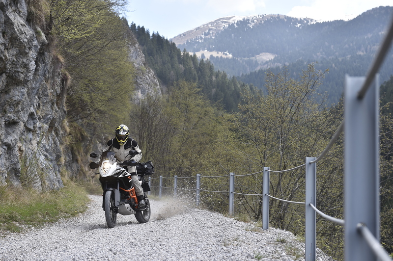 La 1050 è piccola tra le gambe e molto agile a bassa velocità. D’altra parte solo i cerchi pesano un chilo meno di quelli a raggi e questo si sente nella guida. I comandi sono morbidi e precisi come su tutte le Adventure. La sella non è regolabile, ma risulta comoda e ospitale anche sulle lunghe percorrenze. Non ci sono vibrazioni, mentre la protezione dall’aria lascia scoperte le spalle e la parte alta del casco (la cosa si sente soprattutto se superate il metro e ottanta e indossate un casco con la visiera da cross). Il rumore di scarico è profondo e sportivo come dev’essere con un V2 LC8, mentre è sopra la media la rumorosità meccanica ai bassi regimi. L’erogazione del bicilindrico è perfetta per la guida stradale. Ci sono “solo” 95 cavalli, ma sono disponibili tutti dai 2.000 ai 6.000 giri: in questo range la 1050 va esattamente come la potente 1190. Ai bassi il twin austriaco è regolare e gentile, inizia a strappare solo sotto i 2.000 giri se si insiste con le marce alte. La spinta è piena e coinvolgente sino a circa 7.000 gira, poi la curva di potenza si appiattisce e invita a passare al rapporto successivo. Il cambio è rapportato bene e leggero negli innesti, a 130 km/h indicati il motore frulla a circa 4.900 giri. Con 25° abbiamo notato un po’ di calore nella zona dei piedi.