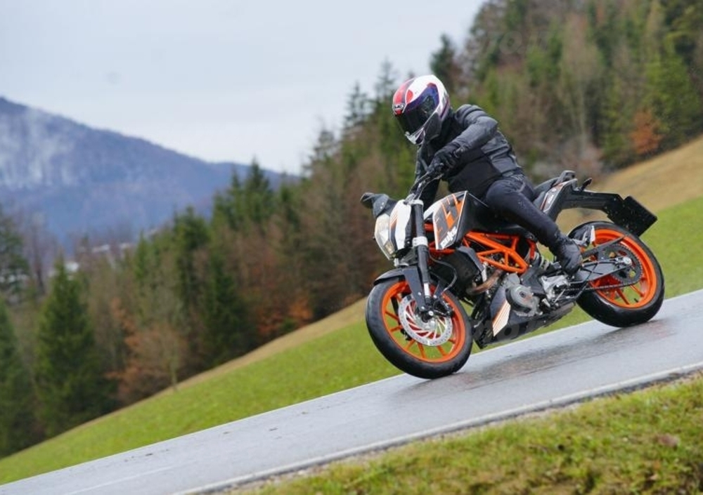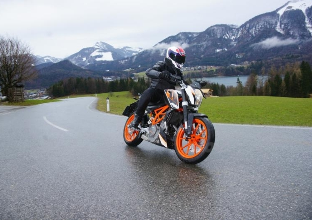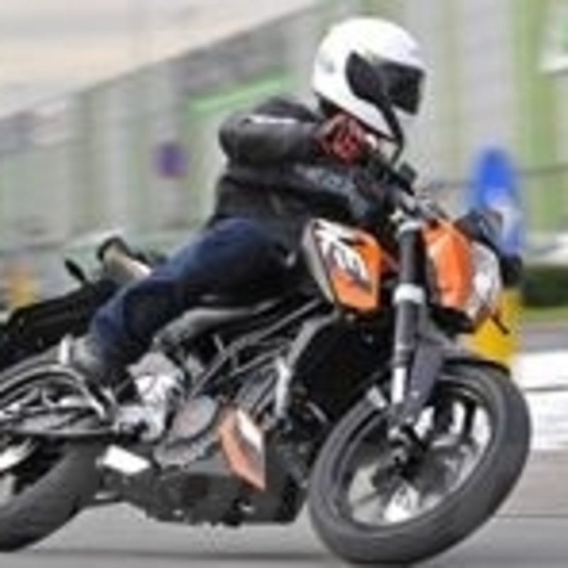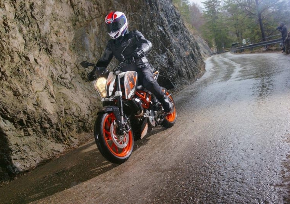 Iniziare un test dinamico sotto la pioggia battente mette decisamente di cattivo umore, ma la facilità e la leggerezza della KTM Duke 390 (139 kg a secco dichiarati) rendono il tutto meno faticoso. Agile e guizzante come una ottavo di litro, in sella a questa naked si sta abbastanza bene. Oltretutto quello che si tocca e che si vede appare ben fatto e allineato al costo di acquisto. Premettiamo che chi oltrepassa il metro e ottanta troverà le pedane leggermente arretrate e non riuscirà ad inserire al meglio le ginocchia negli incavi del serbatoio, ma per il resto, e soprattutto per chi non raggiunge tale altezza, tutto a posto. Anzi no, la sella, che già durante la prova della 125 era risultata poco imbottita, su questa 390 avrebbe meritato un comfort maggiore visto l'utilizzo a più ampio raggio che permette questa KTM. Un peccato anche perché l'assetto delle sospensioni è tutt'altro che rigido, pur senza risultare sfrenato, e raggiunge un giusto compromesso tra la guida brillante e turistica. Un compromesso è anche il motore, che da una parte deve essere civile e poco assetato, mentre dall'altra deve offrire prestazioni degne di una KTM. Ci riesce? Direi di sì, visto che nell'arco dei 140 km del test i consumi medi sono stati di circa 28 km/l, con punte di 32 nei tratti a velocità costante (consentiti da una sesta marcia decisamente lunga), mentre il motore, ha dimostrato di essere anche discretamente brillante, se tenuto su di giri, e se si chiama a rapporto più frequentemente il cambio a 6 marce, che di suo ci mette precisione e rapidità. Sotto i 6.000 giri il monocilindrico è più lineare che non muscolare. Oltrepassato questo regime dimostra di avere carattere, particolarità che finisce soltanto con l'intervento del limitatore a 10.000 giri. Sorprendente il discorso delle vibrazioni, poche o nulle ai bassi e medi regimi, si affacciano solo all'approssimarsi del regime massimo di rotazione.