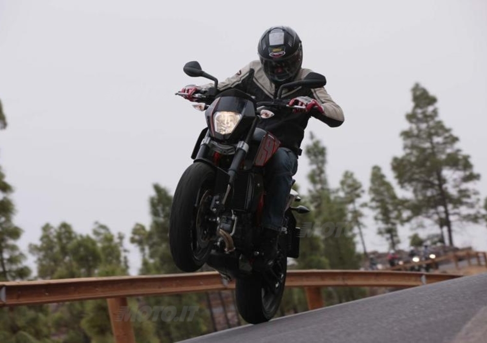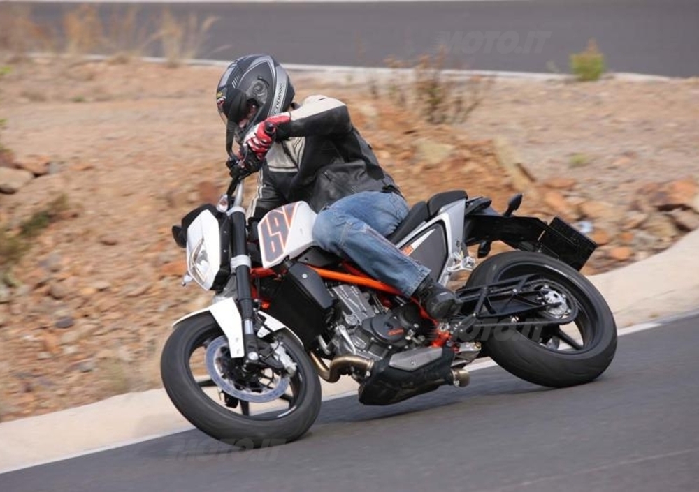 Al pilota non resta che scegliere come guidare la sua Duke. In stile supermoto, ritardando al massimo l’ingresso in curva, o da naked sportiva, impostando traiettorie rotonde e pulite. In entrambi i casi le soddisfazioni sono tante, merito di un progetto riuscito e di un motore che, anche nel 2012, rappresenta lo stato dell’arte tra i grossi monocilindrici.