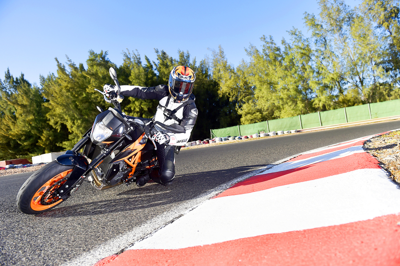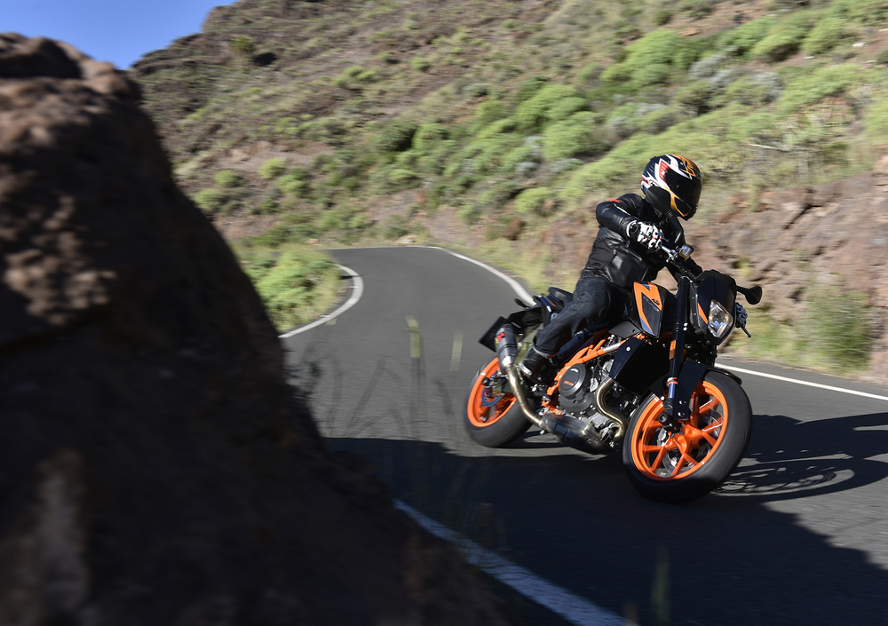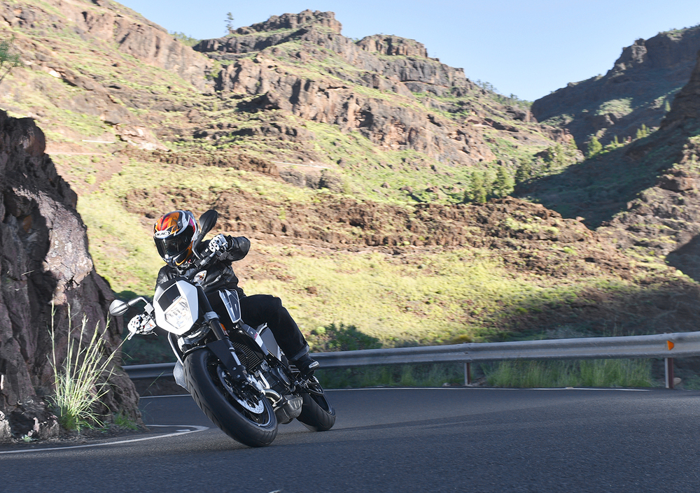 L'Onore di scendere in pista, sul tracciato di Maspalomas è riservato alla sola 690 Duke R, che forte d una dotazione tecnica di tutto rispetto, e con un rapporto peso/potenza che promette solo cose belle in termini di guidabilità e prestazioni, come abbiamo avuto modo di apprezzare nei chilometri percorsi su strada, strappa consensi e sorrisi sotto al casco nel giro di poche centinaia di metri di pista. Il breve tracciato adiacente l'Oceano si adatta alle caratteristiche di guida della monocilindrica austriaca, e finalmente possiamo dare sfogo all'aspetto ignorante che avevamo percepito nella prova su strada. Forti della mancanza di strapiombi e possibili pullman nascosti dietro a una curva, diamo fondo a tutti i 75 cv del monocilindrico e teniamo il motore nella zona alta del contagiri per gran parte del tempo, utilizzo che sembra piacere parecchio al nuovo motore. La leggerezza che tanto abbiamo apprezzato nella guida su strada, viene esaltata tra i cordoli, non solo nei cambi di direzione che richiedono il minimo dello sforzo, ma anche in frenata, dove la massa contenuta limita in maniera evidente l'inerzia, permettendo di chiudere o allargare le traiettorie a piacimento, con il Cornering ABS che consente di infilarsi in curva con i freni ancora ben tirati.