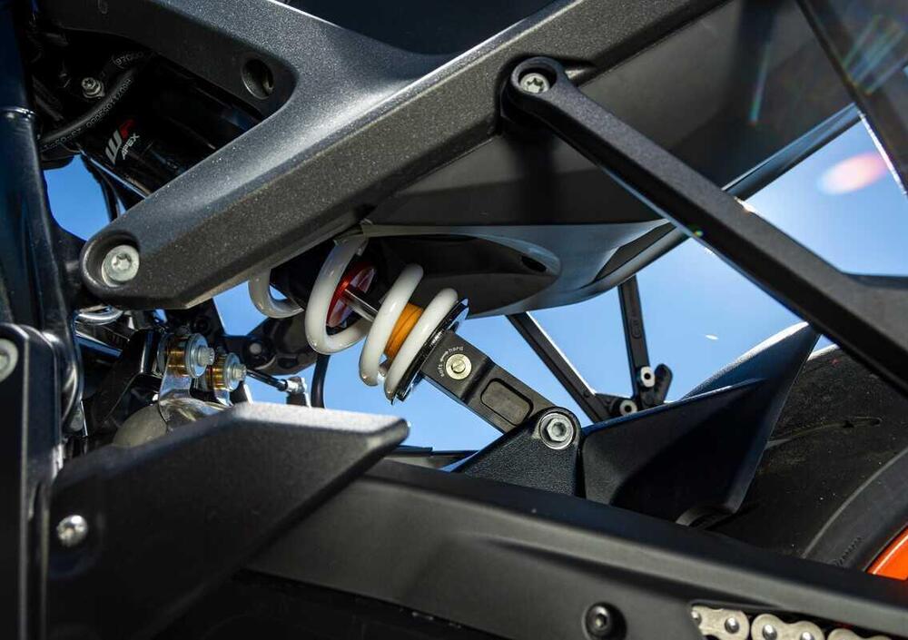 La SUPER DUKE 1390 R monta una forcella WP APEX da 48 mm completamente regolabile, mentre sul mono è possibile intervenire separatamente sulle impostazioni della compressione alle alte e basse velocità, l'estensione e il precarico senza l’utilizzo di attrezzi.