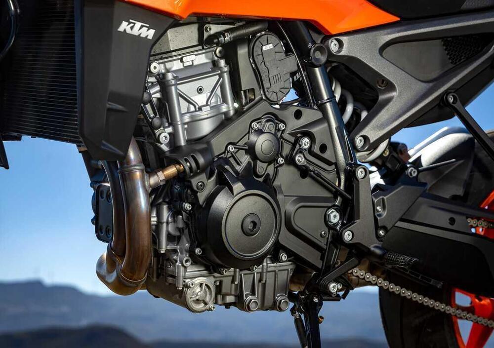 A spingere la 990 DUKE troviamo un bicilindrico parallelo da 947 cc di derivazione 890 Duke ma rispetto a questo cambia praticamente tutto. Sono nuovi i pistoni, l'albero motore e le bielle, oltre al radiatore, ora di maggiori dimensioni. Le inerzie maggiori dovute dalle maggiori dimensioni degli organi in movimento dovrebbero garantire una risposta meno brusca e più fluida, mentre la potenza è di 123 CV a 9.500 giri e la coppia 103 Nm a 6.750 giri, per un peso contenuto in 179 kg.