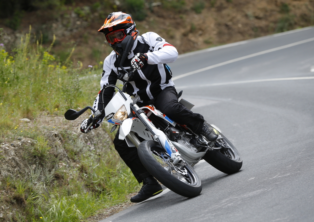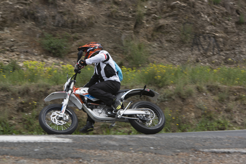 In città si sguscia nel traffico che è un piacere. Il peso praticamente nullo, unito alla prontezza della risposta del propulsore, fa si che la E-SM in città diventi un’arma letale per affrontare il traffico e dimezzare i vostri tempi di trasferimento. La ciclistica è svelta ed asseconda qualunque manovra, i freni offrono la potenza giusta – quello che è sconcertante, non avendo il rumore del motore, è il sentire tutto quello che vi accade attorno, poter chiacchierare con la persona accanto a voi al semaforo senza sgolarvi. C’è un lato negativo, però: gli altri veicoli non vi sentono arrivare, per cui occhi aperti e pollice sinistro sul clacson.