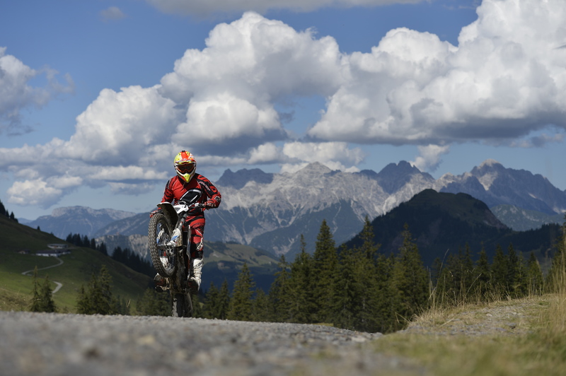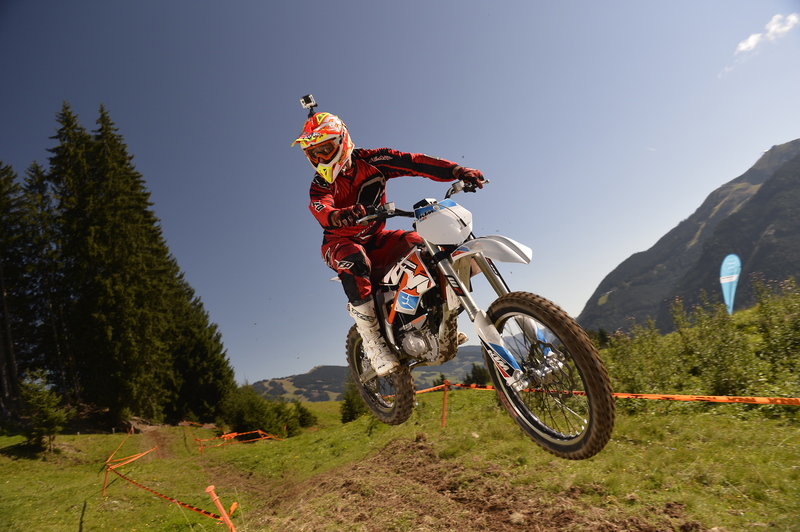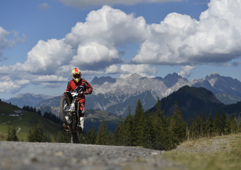 Qui, come in tutte le Alpi, le moto sono vietate. Tra i pascoli d’alta quota si incontrano solo escursionisti, ciclisti, mucche e cavalli. La nostra Freeride E-XC parte dal centro del paesello con il sibilo del motore che attira gli sguardi e i sorrisi della gente. La moto austriaca prende velocità in un attimo, la progressione in basso è davvero entusiasmante, mentre la velocità è autolimitata a 72 km/h, che bastano e avanzano. Le quote ciclistiche nascondono il peso già basso e rendono la Freeride E maneggevole come nessun’altra moto.