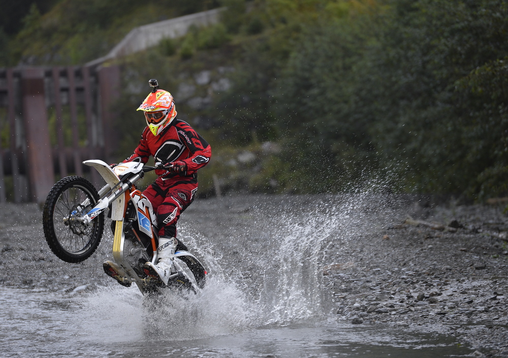 Abbandoniamo presto l’asfalto e iniziamo a giocare tra i sassi bagnati del fiume (motore e batteria sono impermeabili fino a un metro sott’acqua). La trazione è stupefacente, merito del pneumatico enduristico e soprattutto dell’erogazione del propulsore.