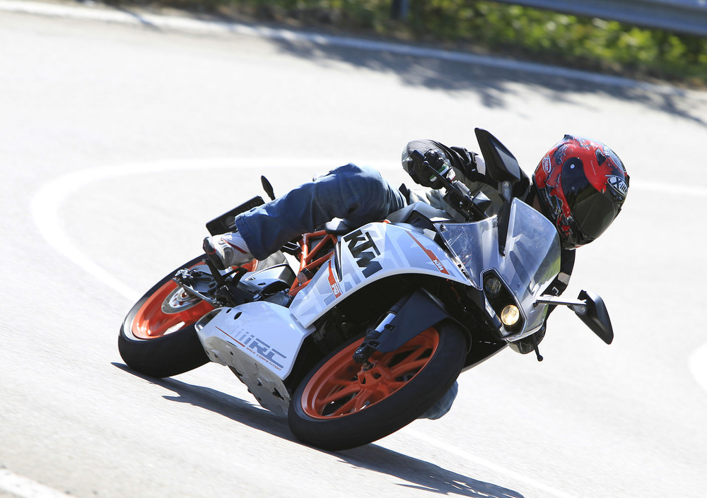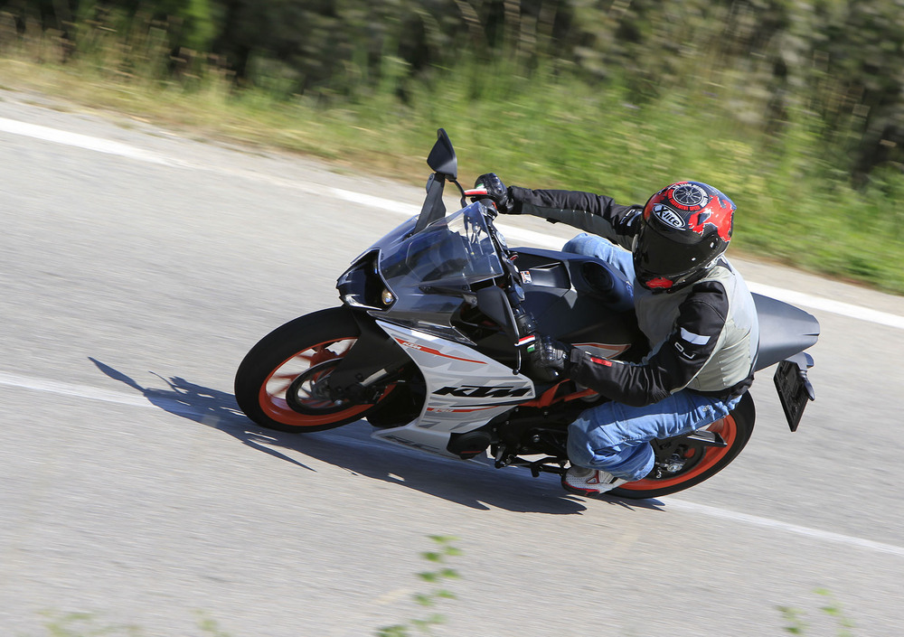 Le modifiche all'ergonomia rispetto alla Duke si percepiscono non appena si sale in sella alla RC390, il busto è decisamente più inclinato in avanti, e fa si che i polsi risultino più caricati. Nel complesso però non ci si trova niente male, certo la sella ha l'imbottitura ricavata da un blocco di marmo di Carrara, ma viene compensata da un assetto delle sospensioni che filtra discretamente le sconnessioni dell'asfalto. Facile e reattiva come ci aspettavamo, la RC390 è intuitiva da guidare e l'erogazione del monocilindrico si sposa molto bene con la filosofia di questa superbike in scala ridotta. Il quattro valvole è pur sempre un mono, e in quanto tale digerisce malvolentieri le piene aperture di gas ai bassi regimi, quindi per evitare di sentirlo strappare e annaspare, meglio aprire una volta che si è varcata la soglia dei 3.500 giri. Oltrepassato tale traguardo, il motore sale lineare fino a 7.000 giri, regime oltre il quale prende coraggio e spinge affievolendosi solo all'approssimarsi del taglio del limitatore, poco oltre i 9.500 giri (una spia rossa sul cruscotto ci avverte pochi istanti prima che avvenga il taglio dell'alimentazione). Su strada, naturalmente, non si sente il bisogno di tirare il collo al motore, mantenendolo tra i 6/8.000 giri si viaggia spediti e contenti, mentre la ciclistica agile e leggera consente di pennellare le curve a piacimento. Due appunti negativi ci sentiamo di farli a proposito della frenata, e del pneumatico posteriore. La prima soffre di una certa mancanza di mordente della pinza anteriore, che richiede uno sforzo sopra la media per restituire una decelerazione solo più che discreta, mentre il pneumatico posteriore, soffre il fatto di essere montato su un cerchio troppo stretto per le sue dimensioni. Questo particolare che rende il profilo più "chiuso", o a pera che dir si voglia, riduce l'area di appoggio del pneumatico, l'ottimo Metzeler Sportec M5, durante le pieghe più accentuate. Niente di trascendentale, l'utente medio di questa moto difficilmente si troverà a spalancare il gas a moto completamente sdraiata, però a noi un profilo più aperto e quindi un appoggio maggiore non dispiacerebbe.